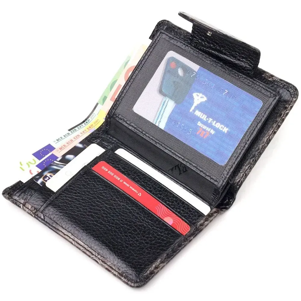 Стильный женский кошелек компактного размера из натуральной кожи, с тиснением под змею. Аксессуар имеет отделение для купюр с перегородкой, монетницу, что закрывается клапаном на кнопку, скрытый карман и семь отсеков для карточек, два из них под сеточкой. Закрывается аксессуар в два сложения хлястиком на кнопку. Качественный кожаный аксессуар всегда считался показателем вкуса и достатка, именно такие изделия представлени в нашем магазине, у нас каждый найдет что-то для себя.