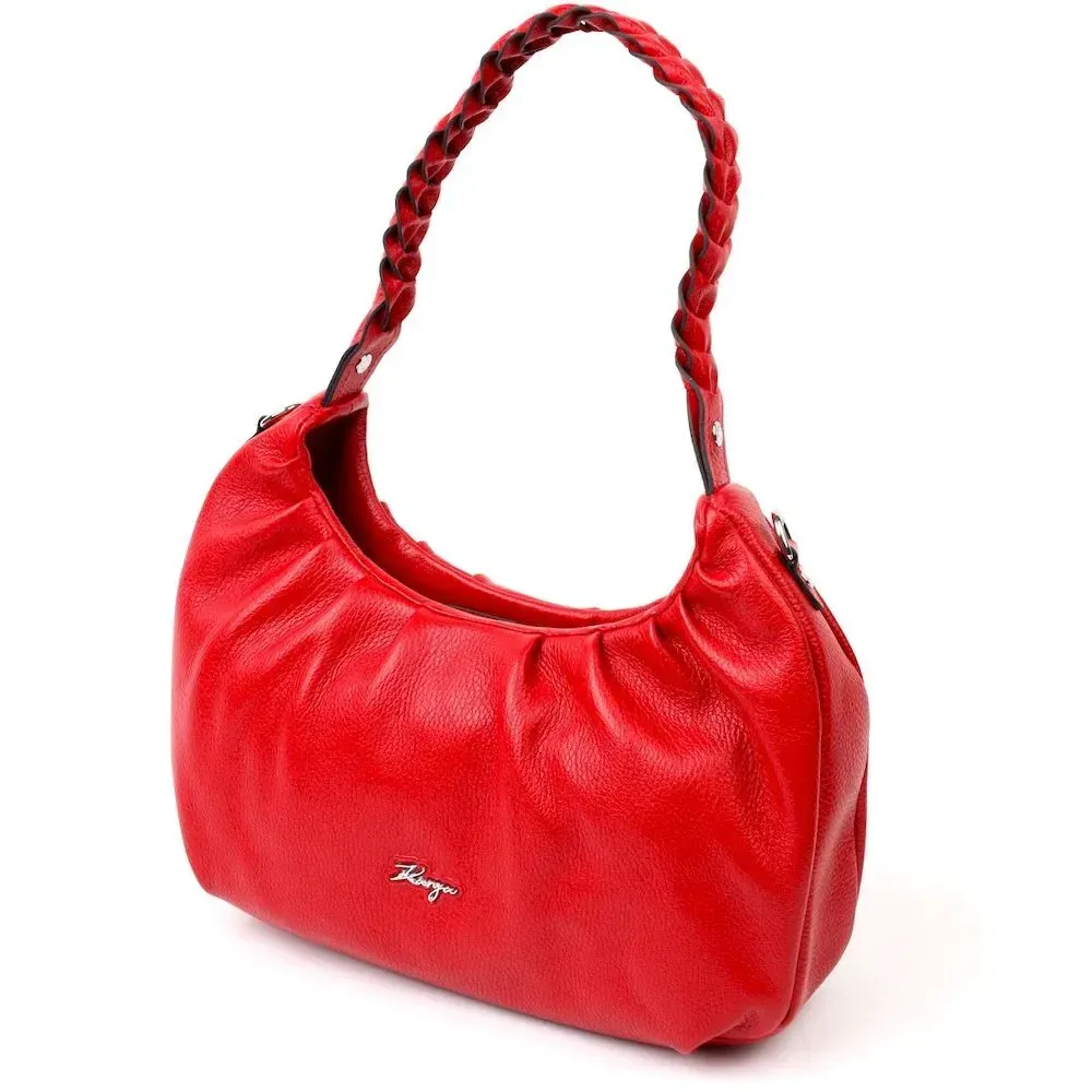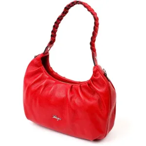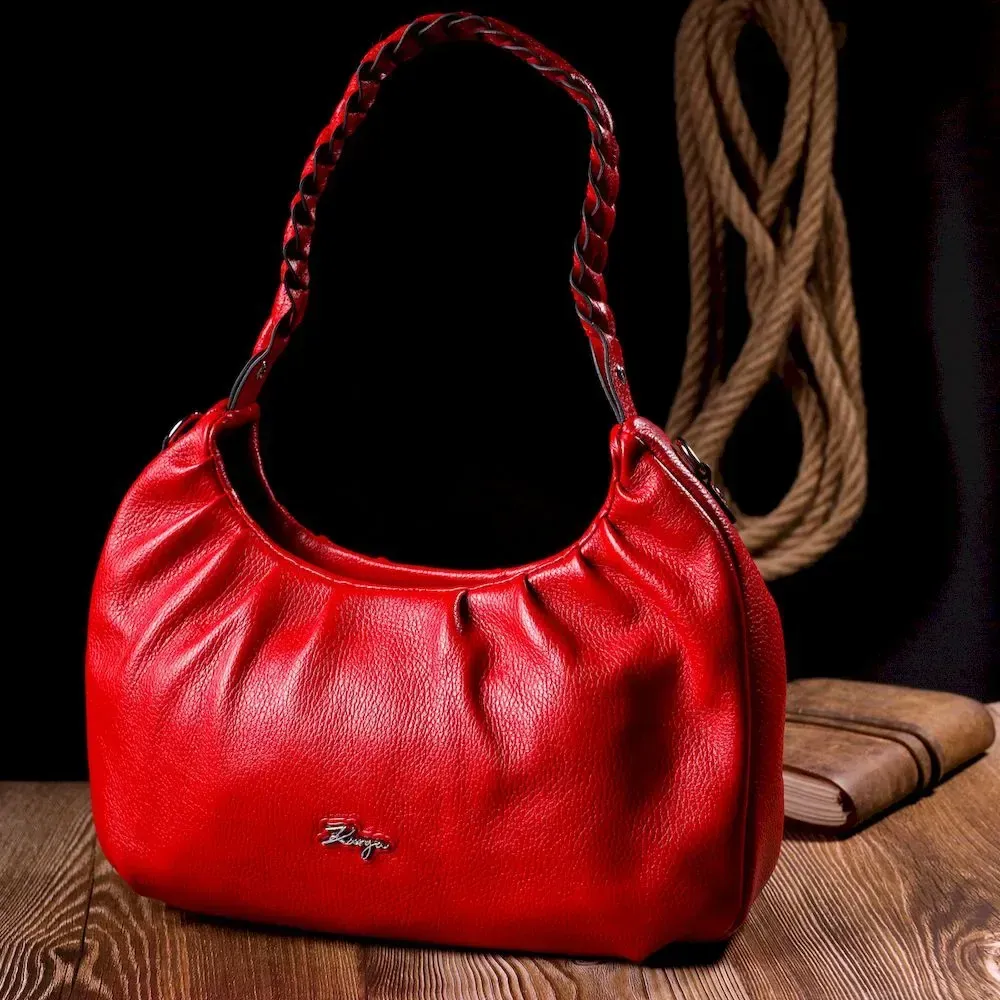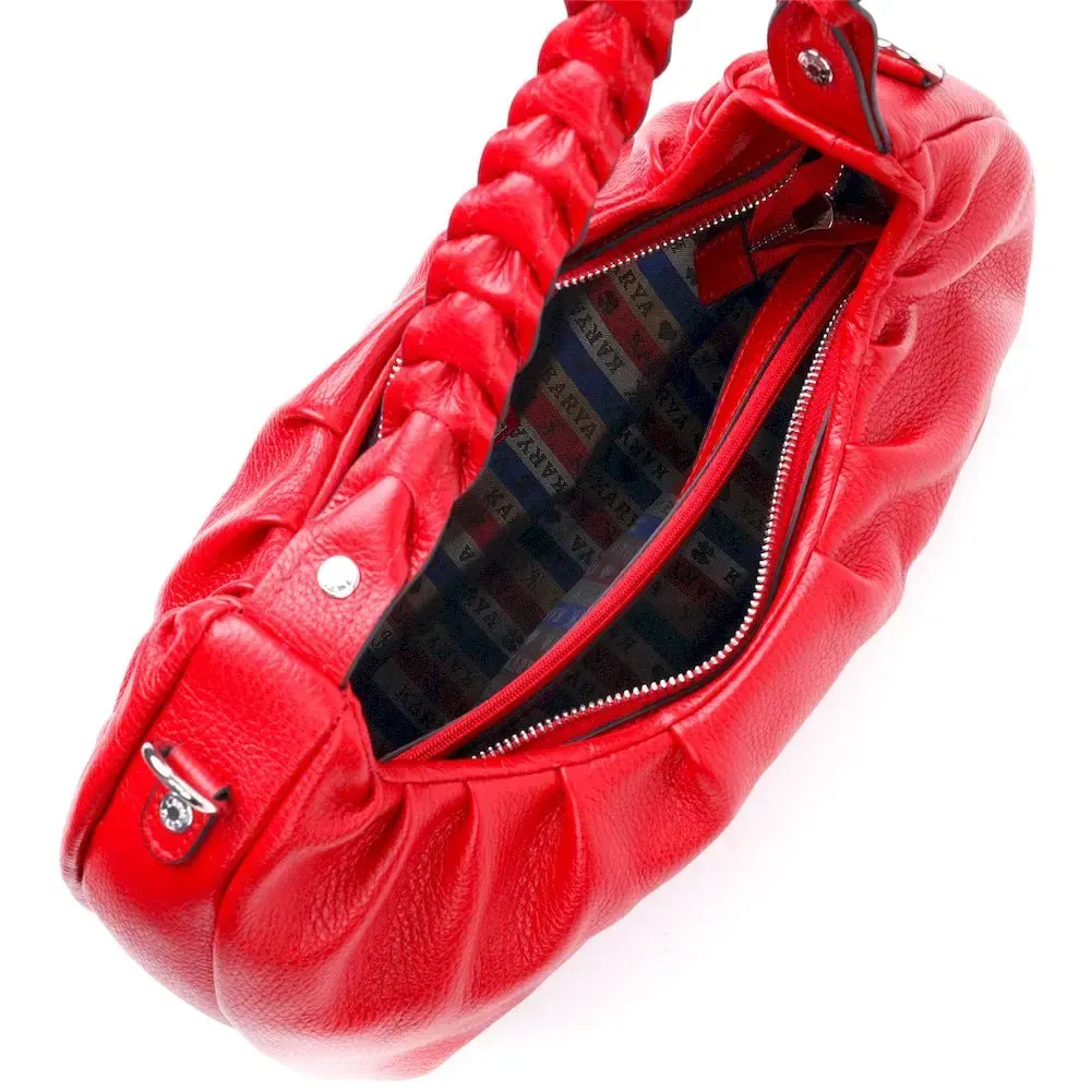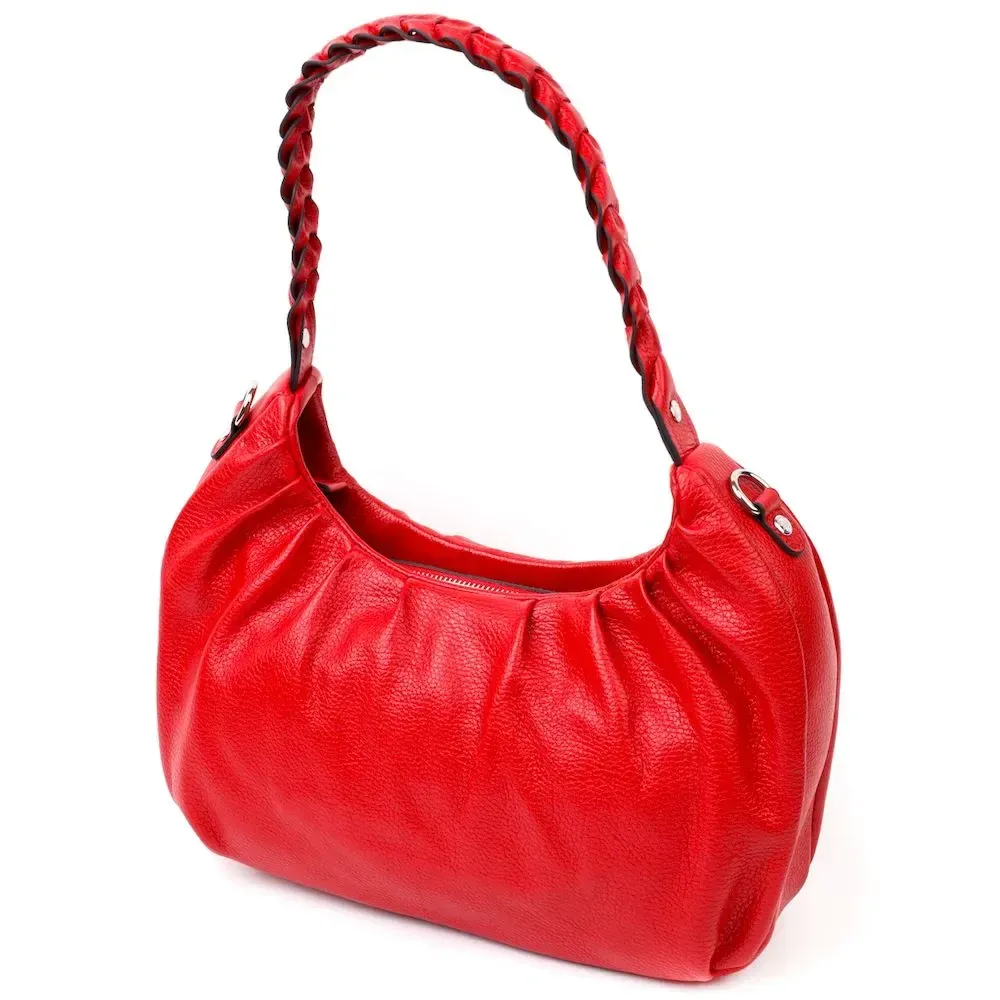 Яркая сумка-багет среднего размера из натуральной крупнозернистой кожи красного цвета. Изделие имеет надежную плетенную ручку для переноса в руке, а также кожаный съемный и регулируемый по длине, плечевой ремень. Сумка функциональна и удобна в эксплуатации, изделие имеет качественную фурнитуру серебристого цвета и прочную подкладку. Аксессуар упакован в фирменный текстильный мешок Karya. Сумка из натуральной кожи всегда будет отличным подарком любой женщине.