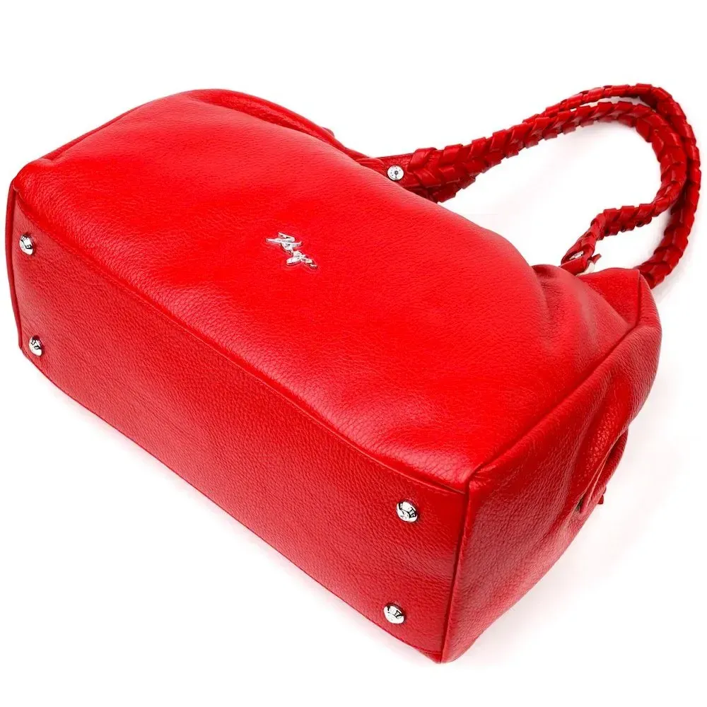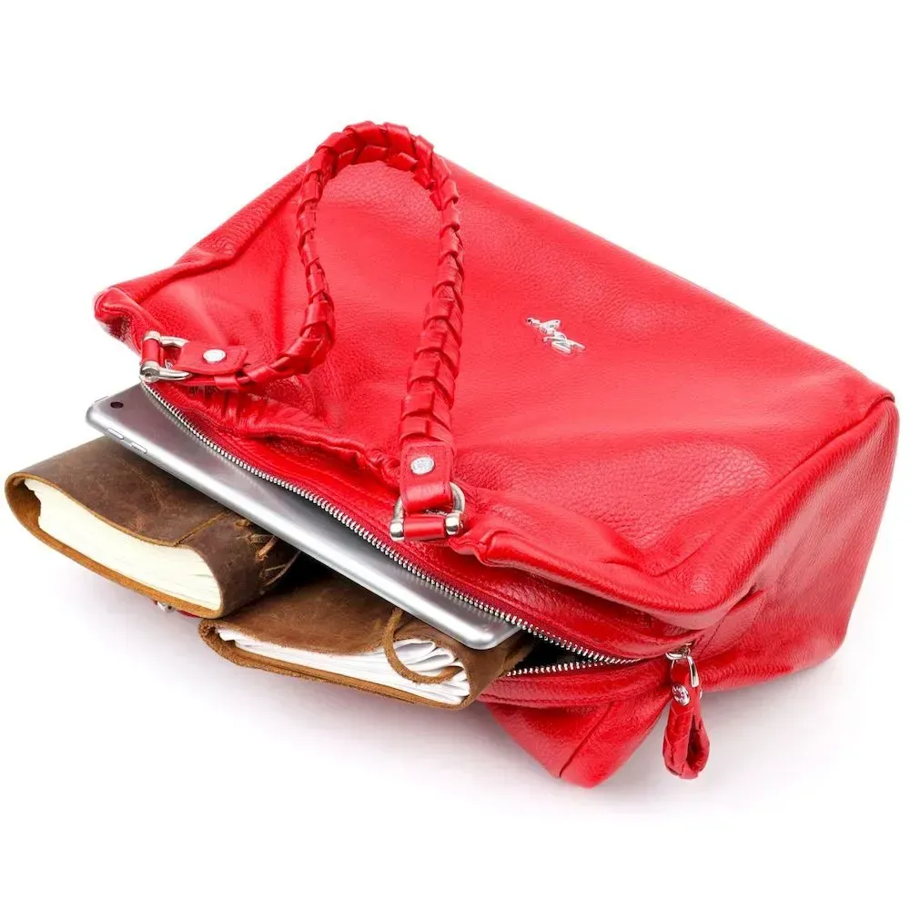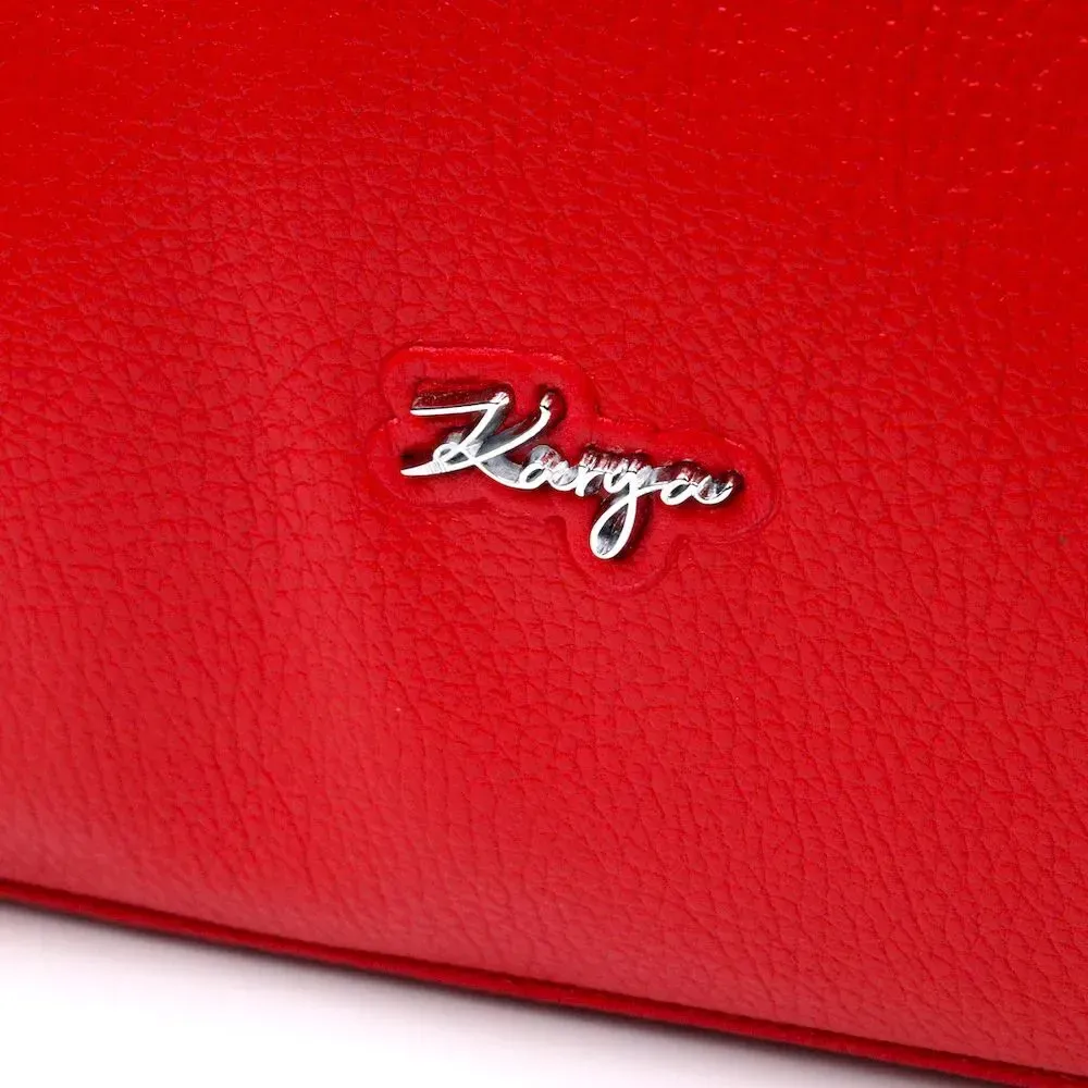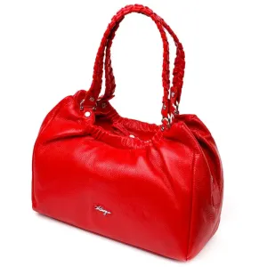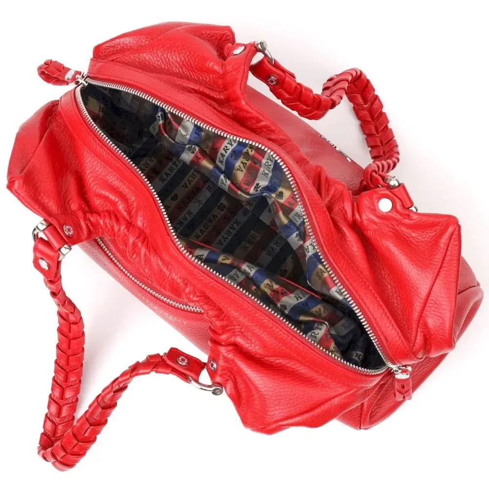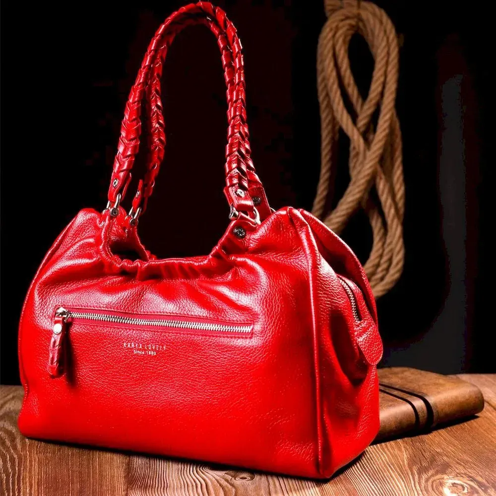 Красивая вместительная женская сумка из натуральной зернистой кожи, красного цвета. Сумка функциональна и удобна в эксплуатации, качественная фурнитура серебристого цвета не только дополняет стильный дизайн сумки, но и защищает изделие. Аксессуар упакован в фирменный текстильный мешок Karya. Сумка из натуральной кожи всегда будет отличным подарком любой женщине.
