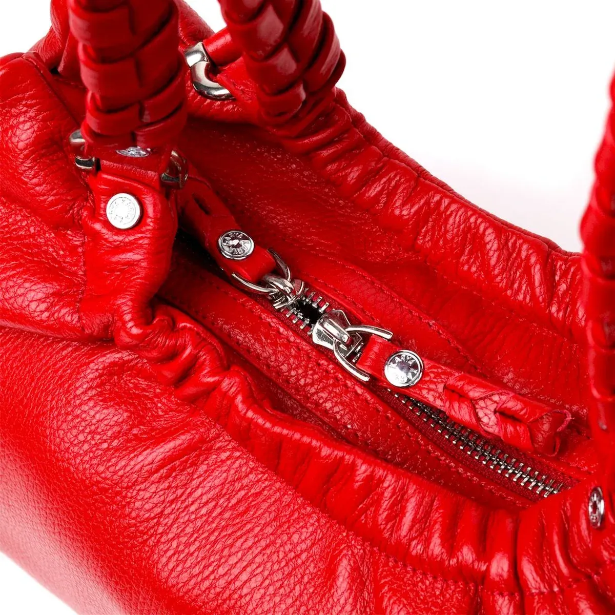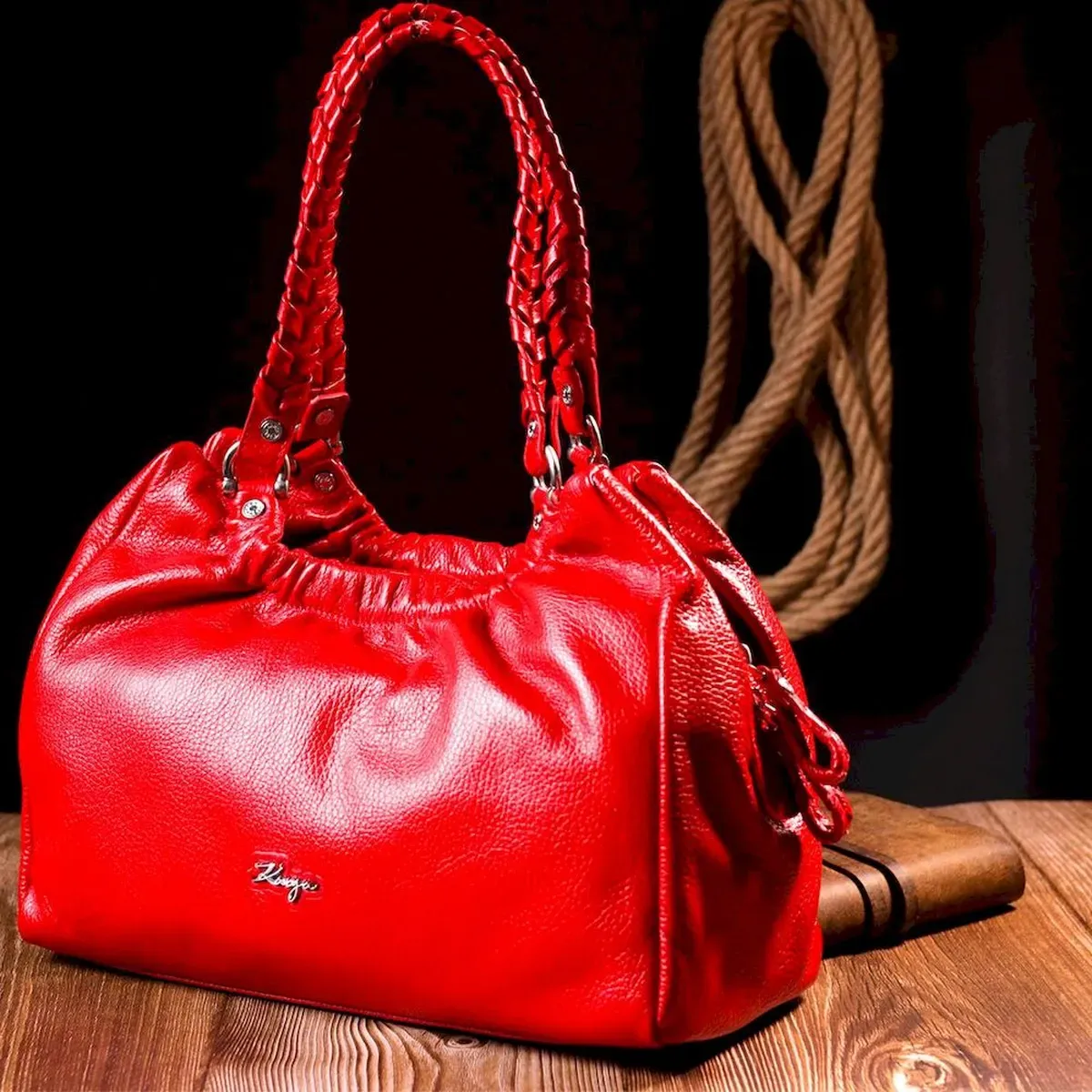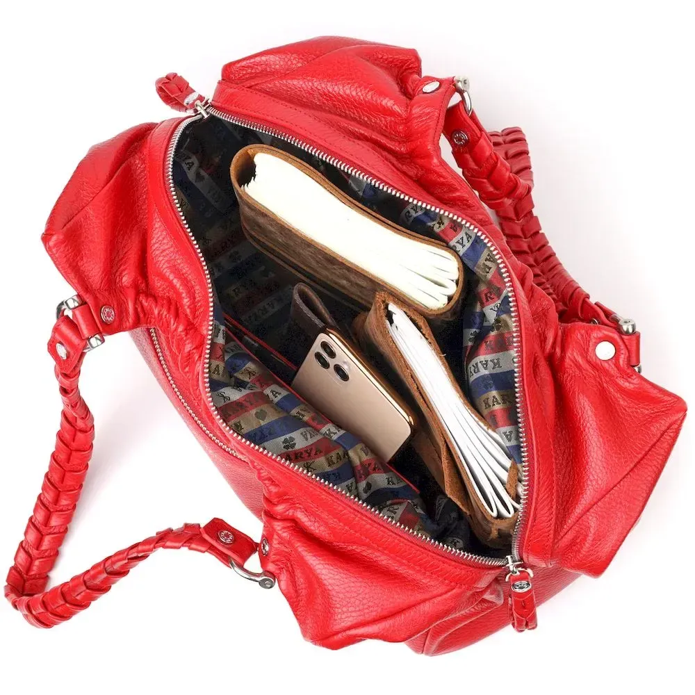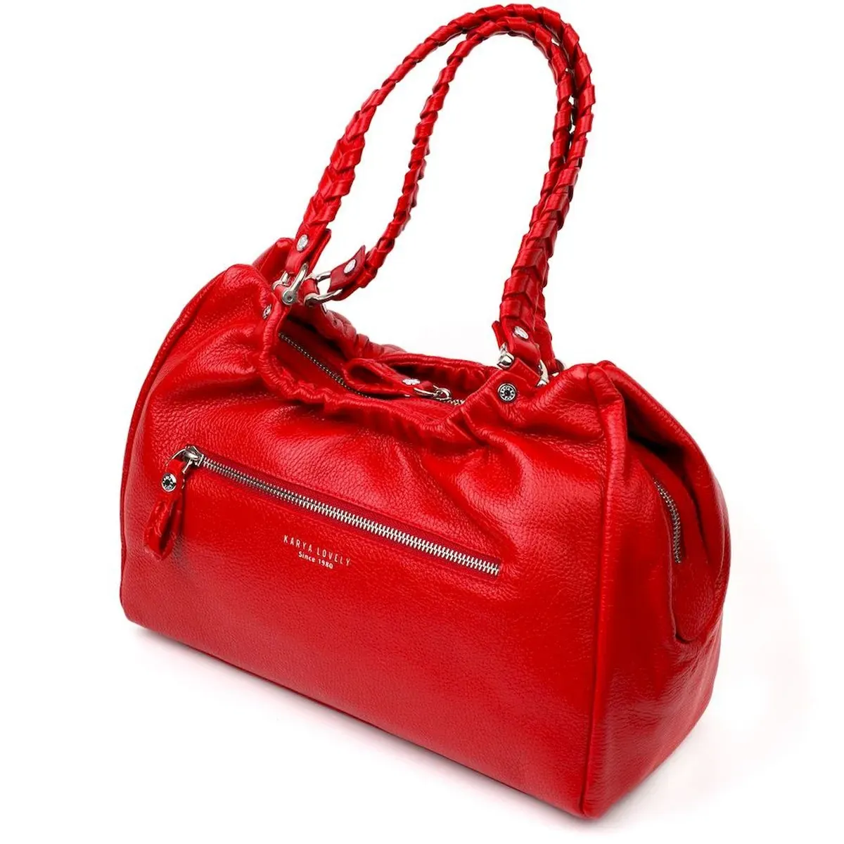 Красивая вместительная женская сумка из натуральной зернистой кожи, красного цвета. Сумка функциональна и удобна в эксплуатации, качественная фурнитура серебристого цвета не только дополняет стильный дизайн сумки, но и защищает изделие. Аксессуар упакован в фирменный текстильный мешок Karya. Сумка из натуральной кожи всегда будет отличным подарком любой женщине.
