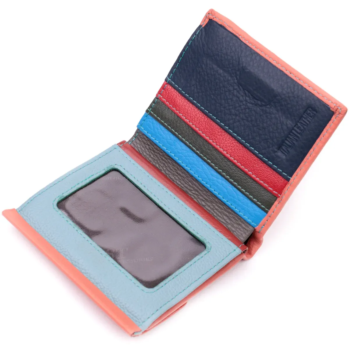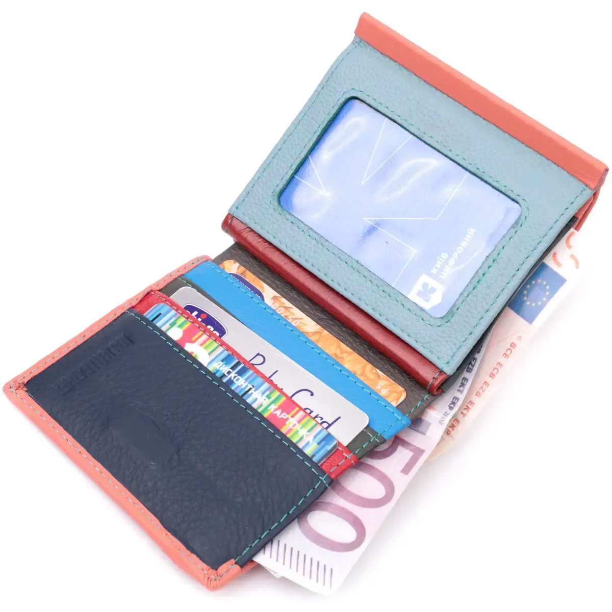 Неординарное цветное портмоне для женщин среднего размера из натуральной кожи высочайшего качества. Акцентом этого кошелька является цвет, точнее несколько цветов - он оранжевого цвета снаружи и многоцветный внутри. Аксессуар состоит из двух вместительных отделений для купюр, кармана на молнии, четырех ячеек для карт, скрытого кармана, прозрачного кармана и кармана для монет. Снаружи изделие прошито ровной строчкой бирюзового цвета по краю и украшено металлическим логотипом компании производителя, который размещен вверху посередине. Портмоне дополнено надежной фурнитурой и крепкой подкладкой. Укомплектован кошелек в фирменную картонную коробку белого цвета.