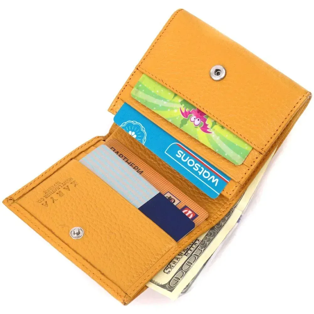 Яркий компактный женский кошелек из натуральной кожи высокого качества. Внутри есть отделение для купюр, шесть ячеек для кредитных карт, необычная монетница и скрытый один карман. В изделии использована качественная фурнитура, а также прочная фирменная подкладка. Небольшой кожаный кошелек поместится даже в самую маленькую сумочку. Закрывается модель в два сложения клапаном на кнопку. Такой кошелек, однозначно, порадует любую женщину.