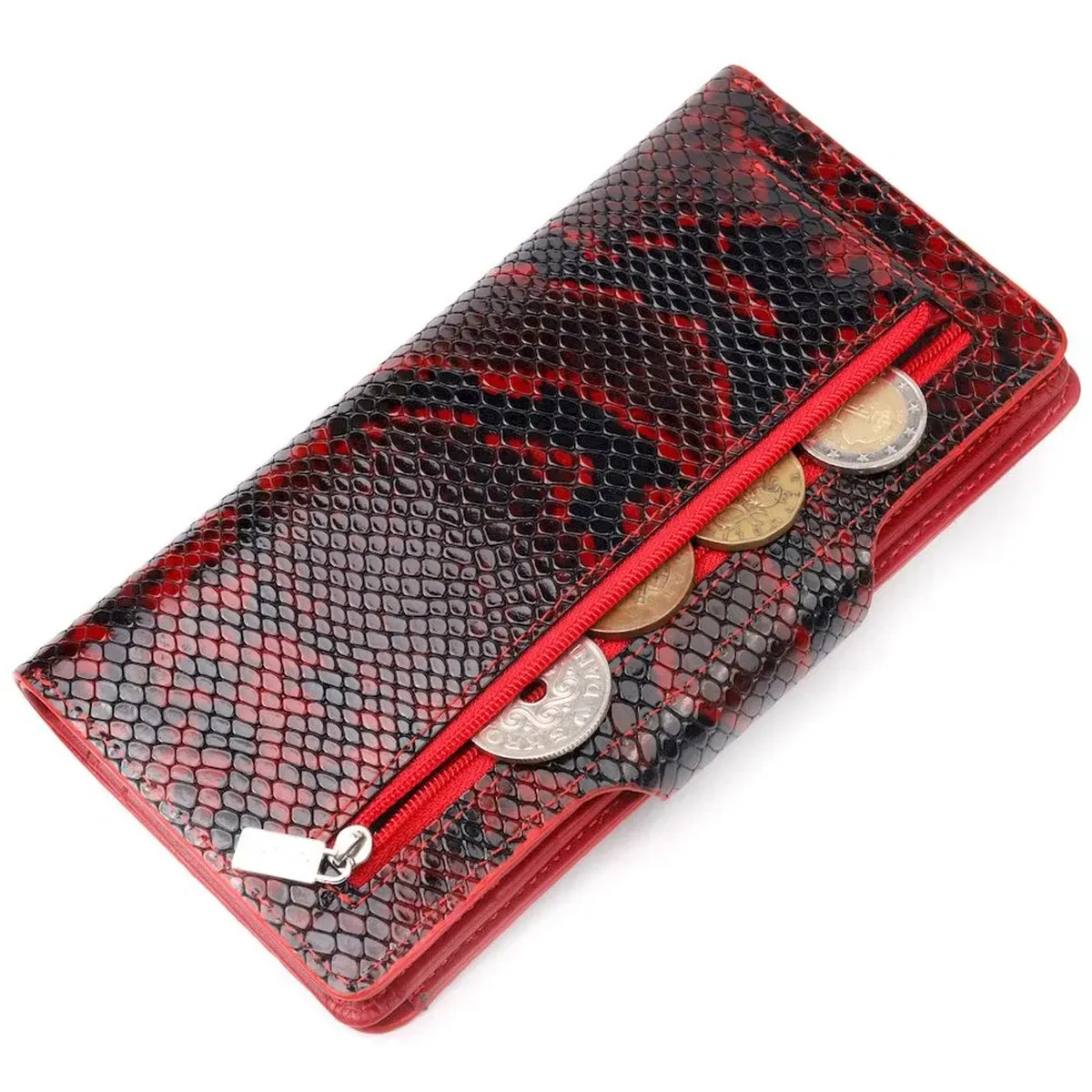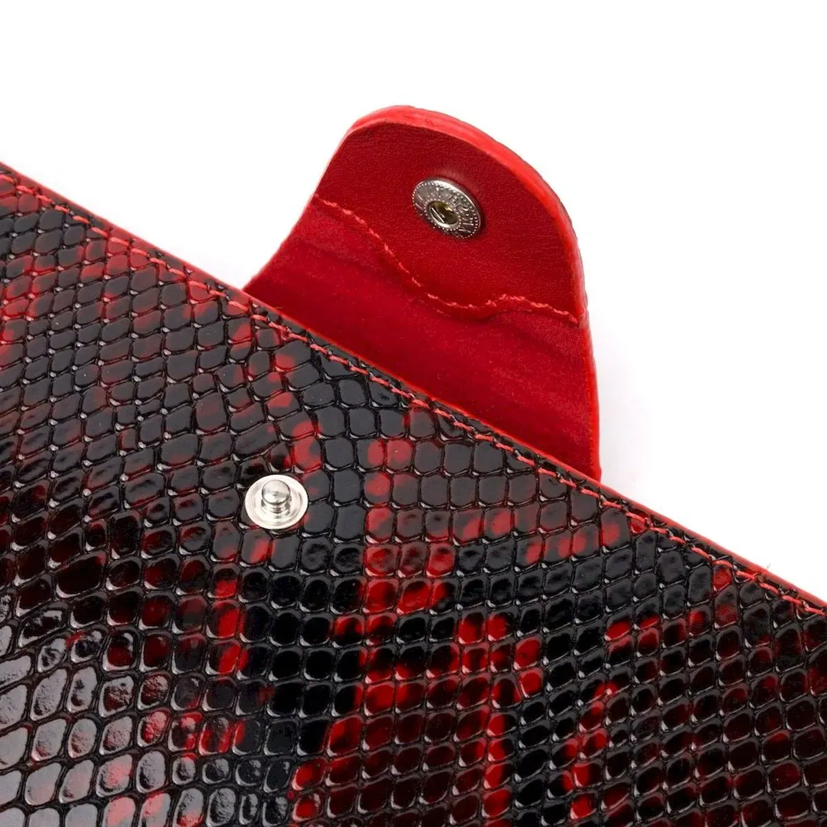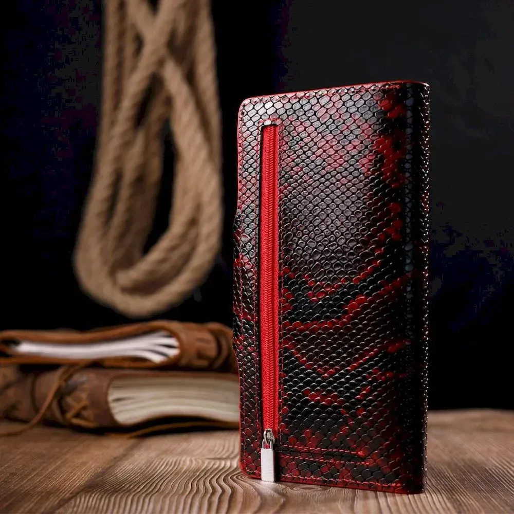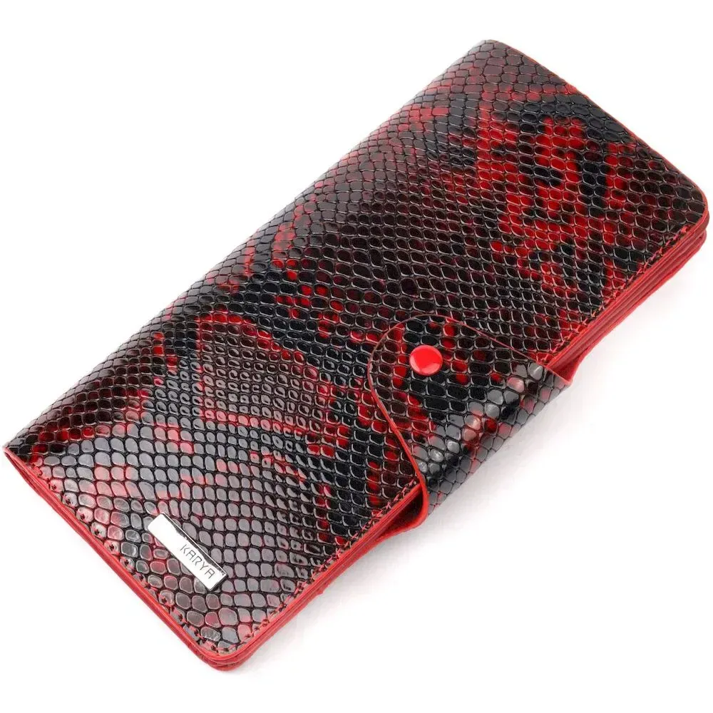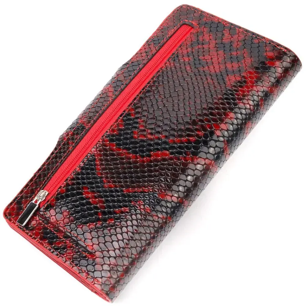 Отличный женский кошелек из натуральной лакированной кожи, с тиснением под змею, в красно-черном цвете. Складывается аксессуар пополам, с фиксацией на хлястик и кнопку. Качественная фурнитура дополняет и украшает изделие. Такой кошелек из натуральной кожи - это идеальный вариант на каждый день для тех, кто ценит качество, удобство и комфорт, а также будет отлично дополнять Ваш повседневный образ.