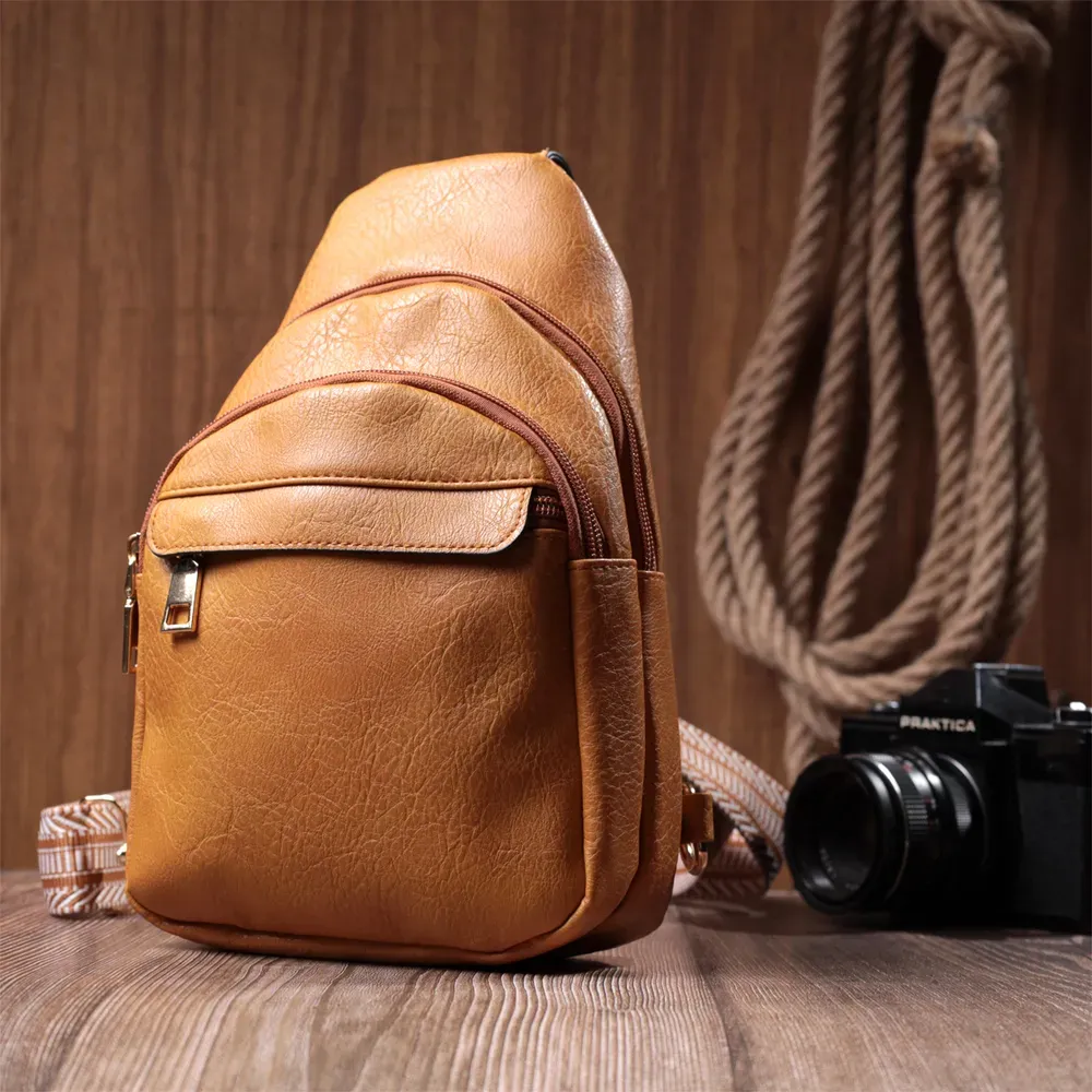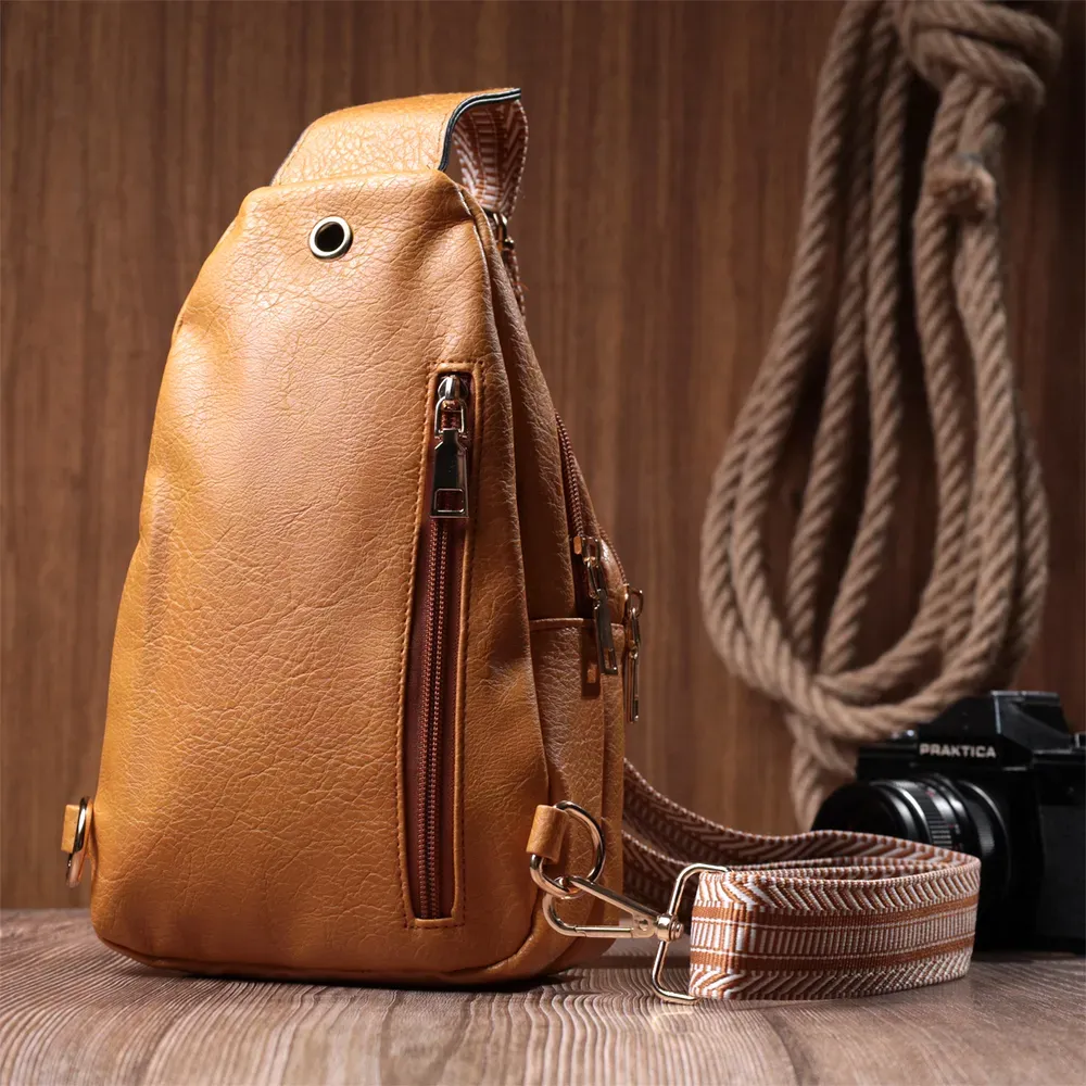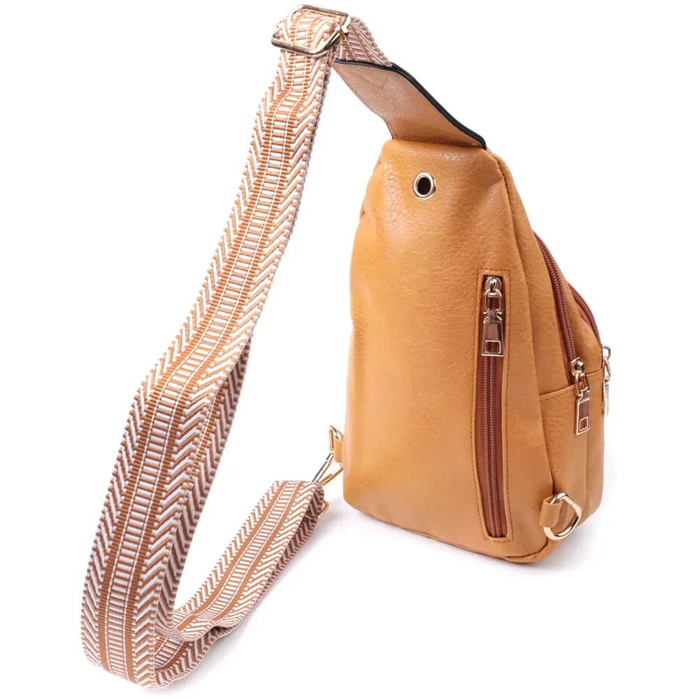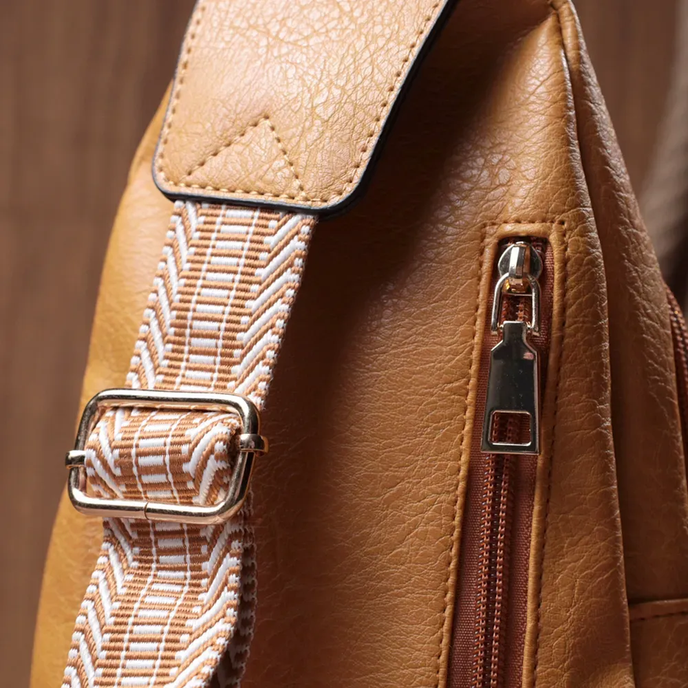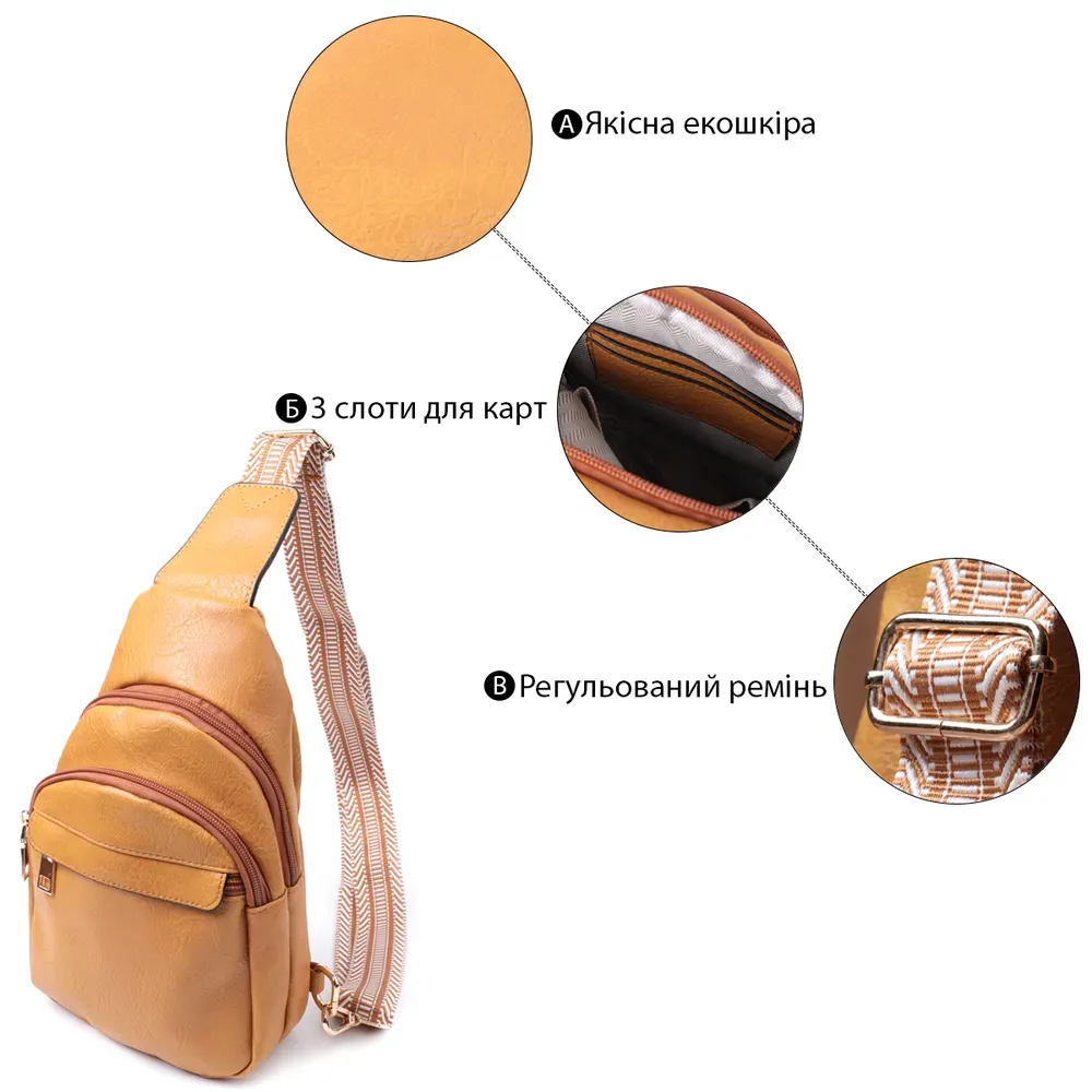 Яскравий варіант сумки для жінок на кожен день із якісної екошкіри, яка є альтернативою натуральній шкірі. Дана модель складається з одного основного відділення, яке закривається на блискавку і в якому знаходиться кишеня на блискавці і три кишені для кредитних карток усередині, а також трьох кишень зовні та одного отвору для кабелю або навушників, що дуже зручно в сучасному світі. Акцентом даної моделі є зручний регульований плечовий ремінець у етнічному стилі, що дуже модно вже кілька сезонів. Екошкіра - високоякісна альтернатива натуральному матеріалу, яка дуже стійка до тертя, до низьких температур, відмінно носиться на відміну від інших штучних матеріалів, а також має гіпоалергенний склад на відміну від натуральної шкіри. Мода не стоїть на місці, на зміну класичним сумкам приходять нові моделі, які обумовлені сучасним часом, саме такою є слінг сумка - зручна, практична, невелика, але містка і головне якісна.
