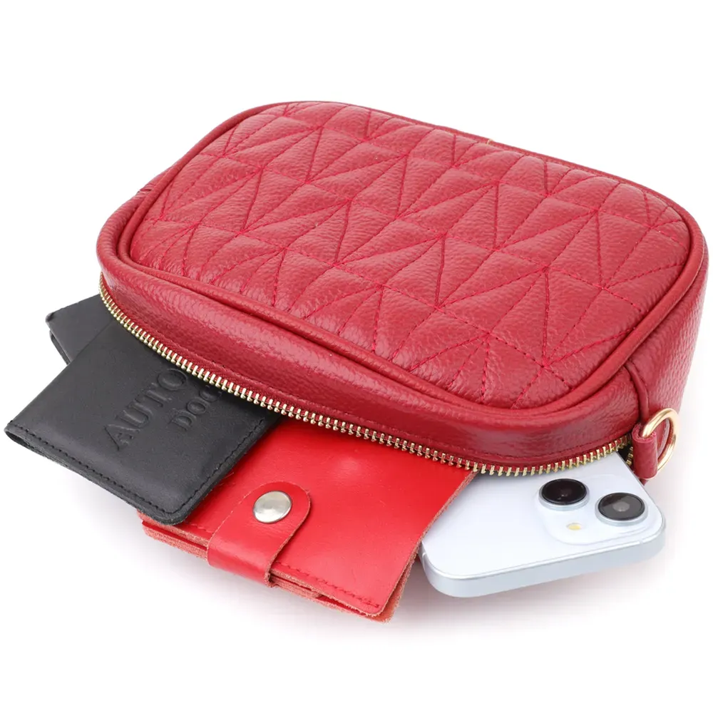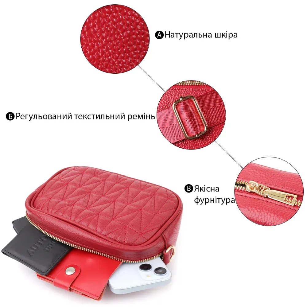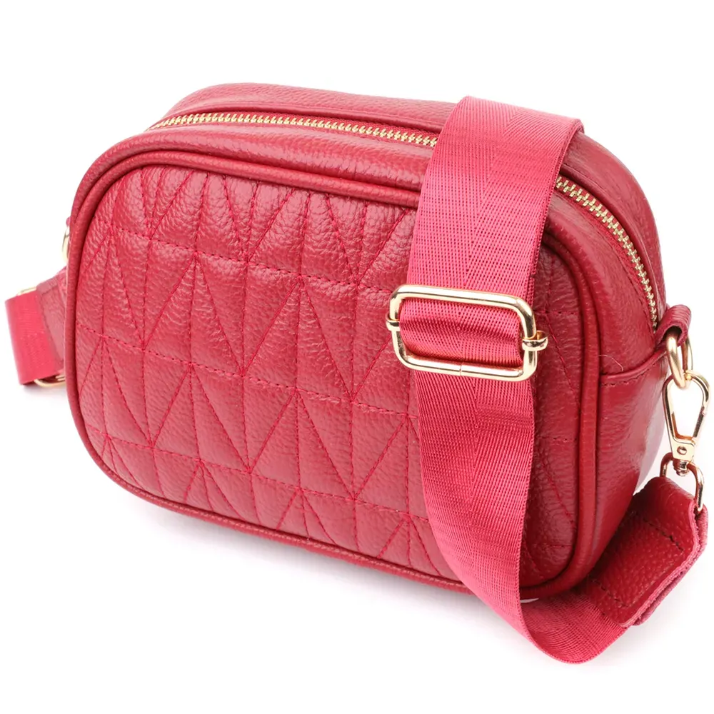 Стьобана сумка для жінок у насиченому червоному кольорі з натуральної шкіри стане ефектним акцентом вашого образу, додаючи яскравості та харизми. Якісна щільна шкіра приємна на дотик і підкреслює високий рівень виконання. Компактна чітка форма робить модель зручною та акуратною, а стібка на лицьовій стороні надає їй витонченого дизайнерського характеру. Сумка закривається на блискавку, всередині знаходиться основне відділення з кишенею на блискавці та відкритою кишенею для дрібниць, а на тильній стороні передбачена зовнішня кишеня на блискавці для швидкого доступу до потрібних речей. Знімний текстильний ремінь, що регулюється, забезпечує комфорт при носінні, а фурнітура під жовте золото стильно відтінює насичений червоний відтінок шкіри. Ця сумка стане універсальним аксесуаром для повсякденних виходів та особливих випадків, підкреслюючи смак та увагу до деталей.