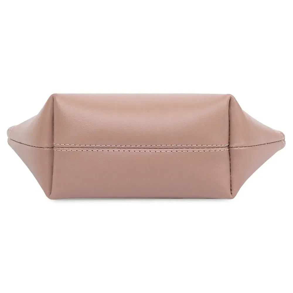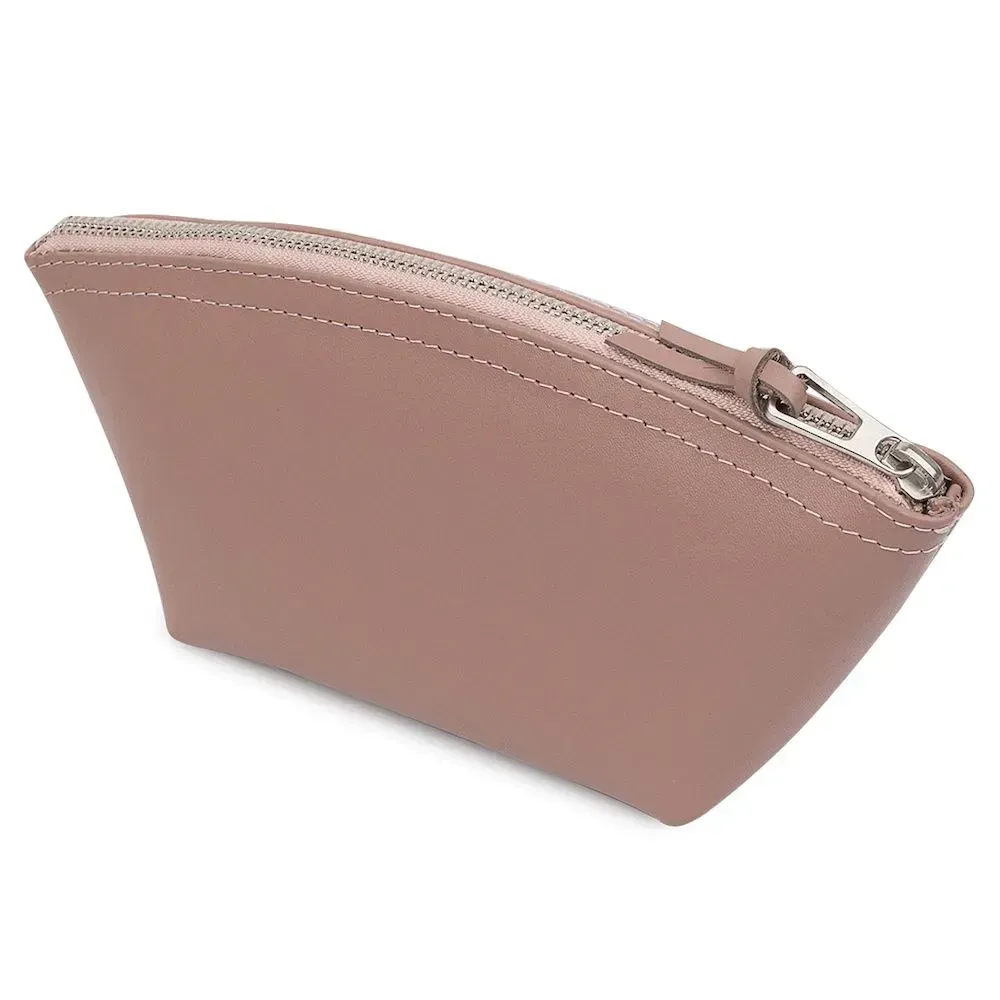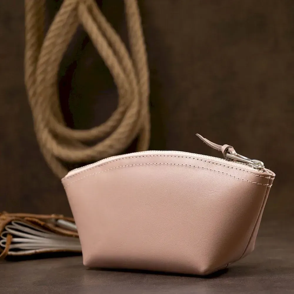 Очаровательная женская косметичка из натуральной кожи, которая устойчива к износу. Имеет нежный бледно-розовый цвет и гладкую фактуру. Внутри есть небольшой карманчик для зеркальца, которое идет в комплекте и имеет кожаную оправу. Закрывается изделие на удобную и надежную молнию.