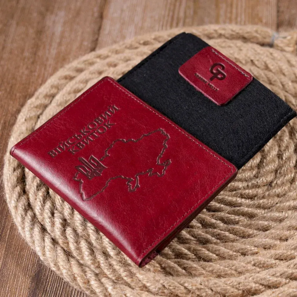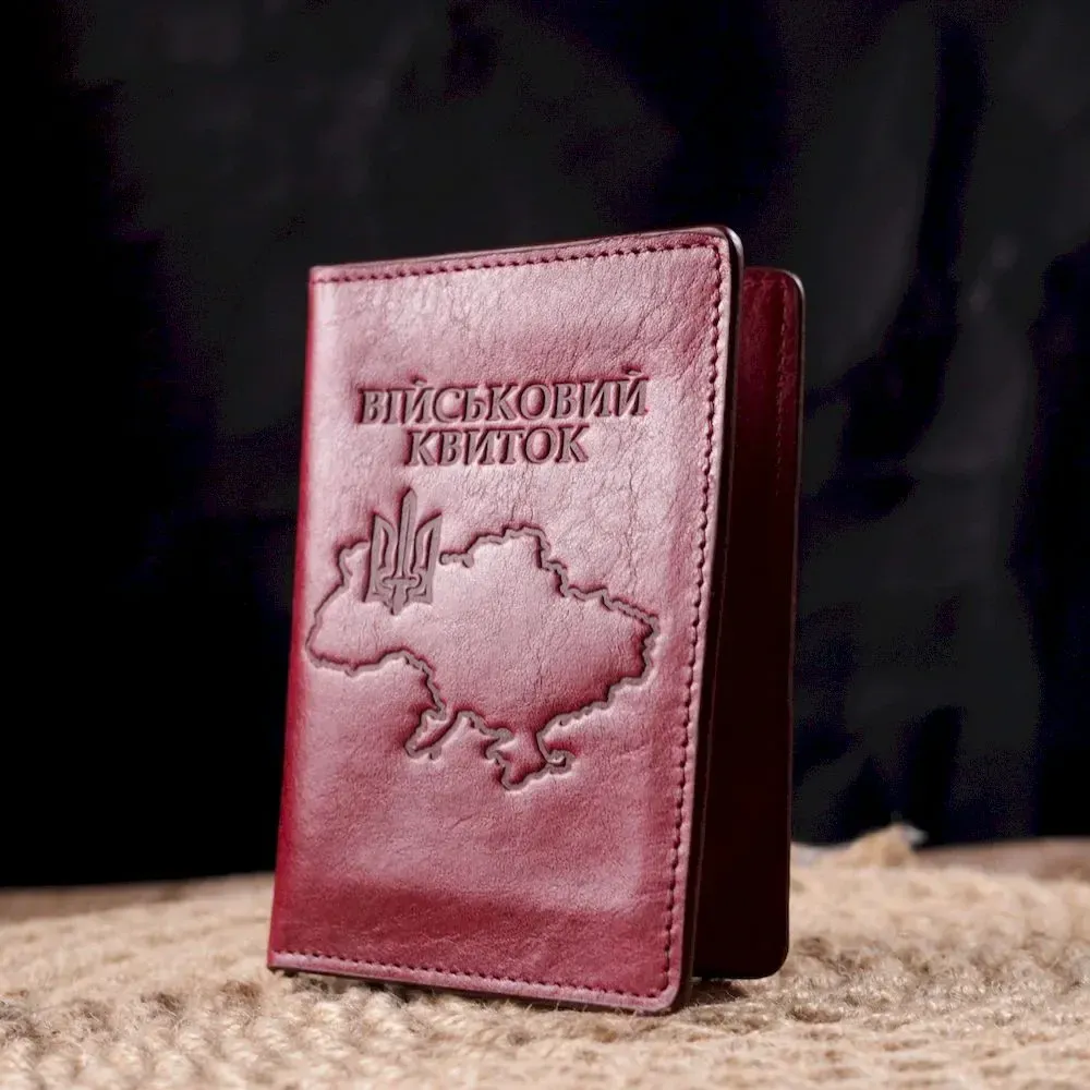Яркая обложка бордового цвета для военного билета с патриотическим тиснением карты Украины, на лицевой стороне. Изделие пошито с качественной гладкой итальянской кожи с высоким показателем износостойкости, которая защитит от повреждений документ на очень долгое время. Аксессуар имеет разворот для военного билета, две ячейки для карточек, без застежки, упакован в фирменный чехол.