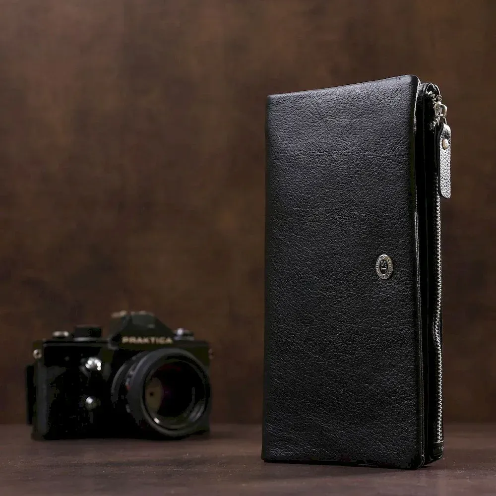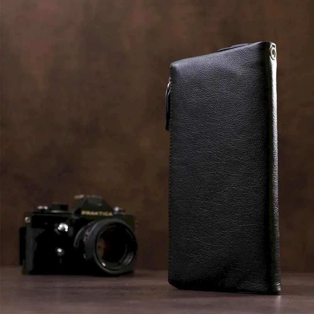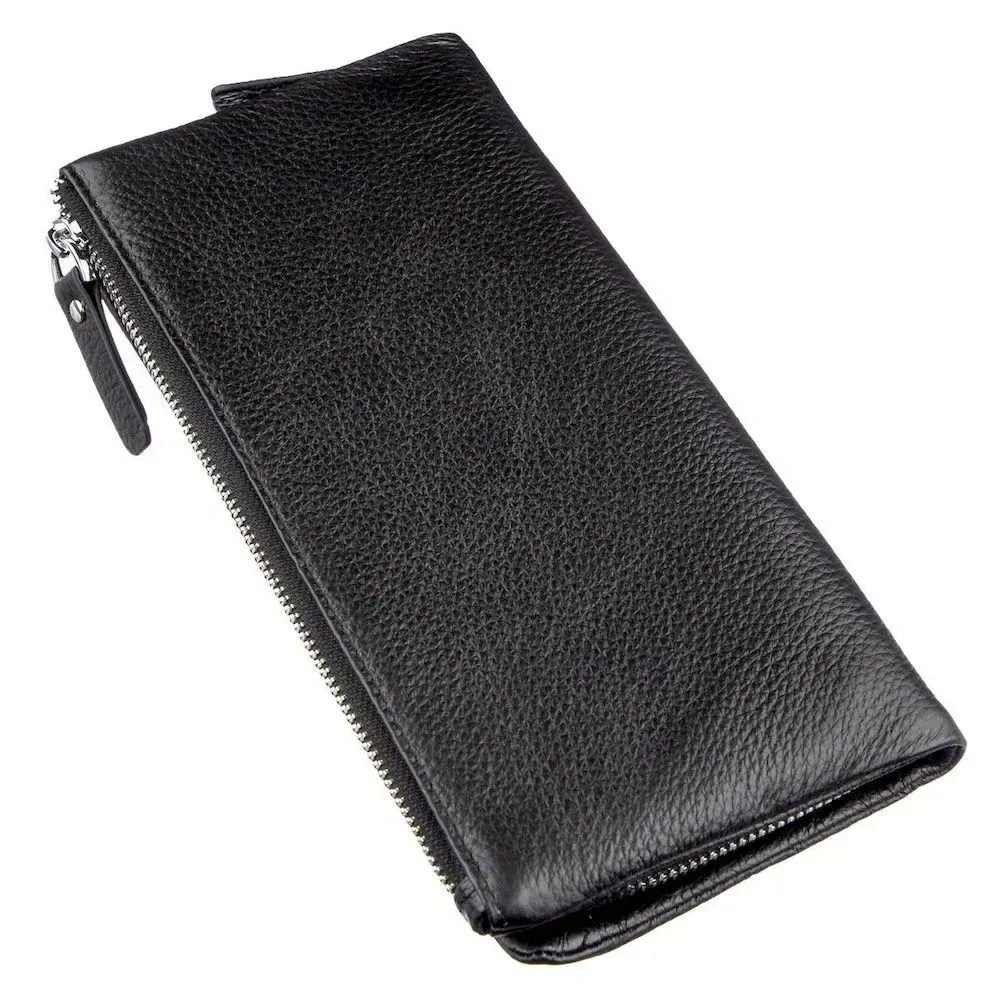 Превосходный женский клатч из натуральной зернистой кожи, мягкой и приятной на ощупь. Выполнен в черном цвете, что очень практично и выгодно подчеркнет Ваш деловой стиль. Имеет достаточное количество удобных отделений для купюр, карточек и прочих мелких, но порой таких необходимых вещей. Такой клатч можно носить в сумке или портфеле, а также и просто как самостоятельный аксессуар. Данная покупка очень Вас порадует. А если Вы сейчас ищите что-то на подарок, то тоже можете смело приобретать данное изысканное изделие. Упакован клатч в твердую картонную коробку.