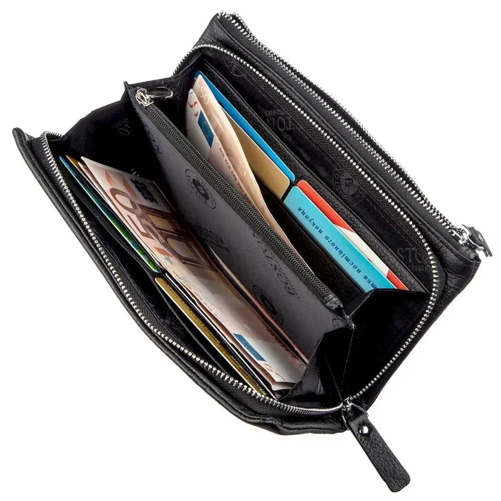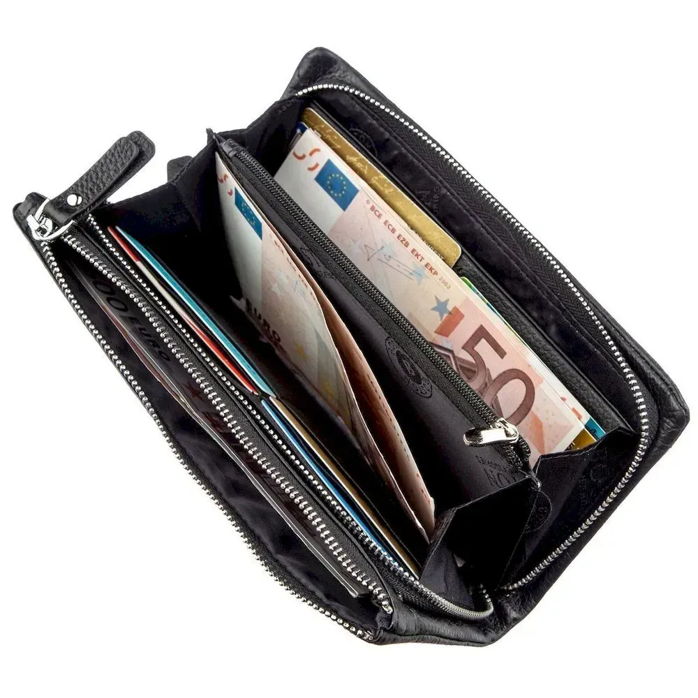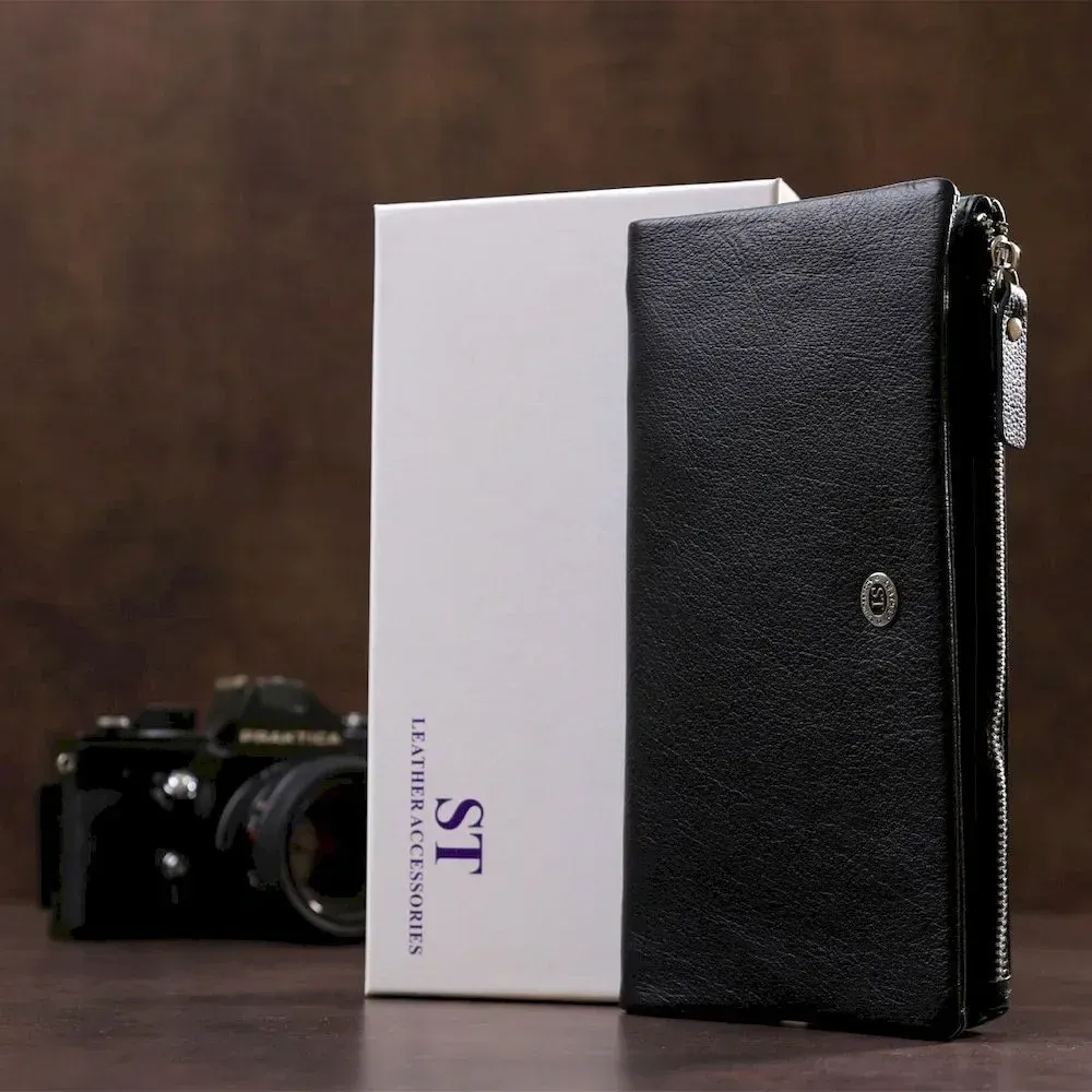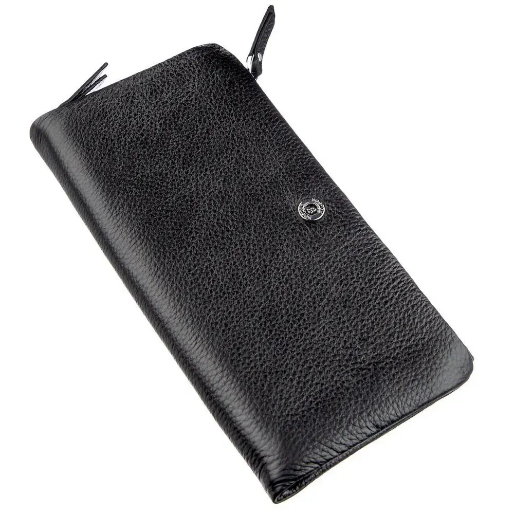 Превосходный женский клатч из натуральной зернистой кожи, мягкой и приятной на ощупь. Выполнен в черном цвете, что очень практично и выгодно подчеркнет Ваш деловой стиль. Имеет достаточное количество удобных отделений для купюр, карточек и прочих мелких, но порой таких необходимых вещей. Такой клатч можно носить в сумке или портфеле, а также и просто как самостоятельный аксессуар. Данная покупка очень Вас порадует. А если Вы сейчас ищите что-то на подарок, то тоже можете смело приобретать данное изысканное изделие. Упакован клатч в твердую картонную коробку.