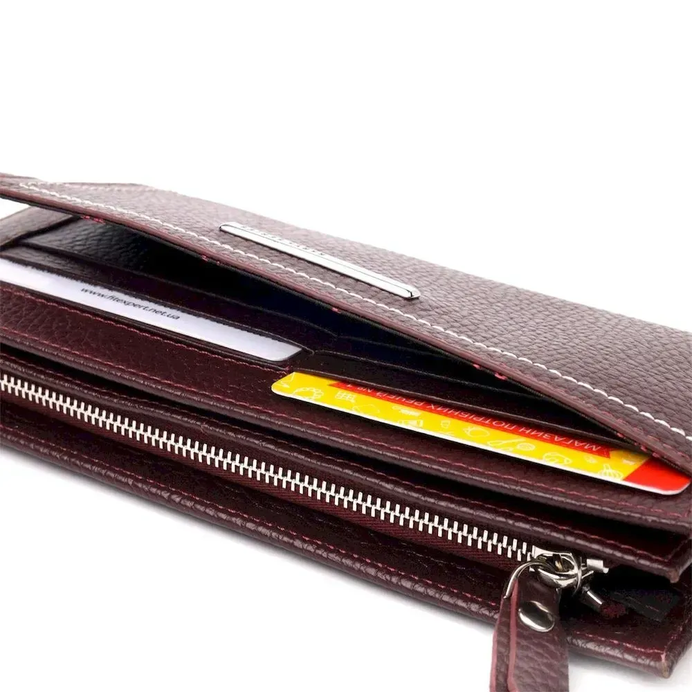 Женский практичный кошелек из качественной натуральной кожи. На лицевой стороне блок для карточек, который прошит белой нитью для декора и закрывается хлястиком на кнопку. Внутри отделения для карт и документов что закрывается на магниты. Отделение на молнии для купюр без сложения. Упакован аксессуар в фирменную коробку и пакет бренда. Изделия из натуральной кожи всегда будут отличным подарком для близкого человека.