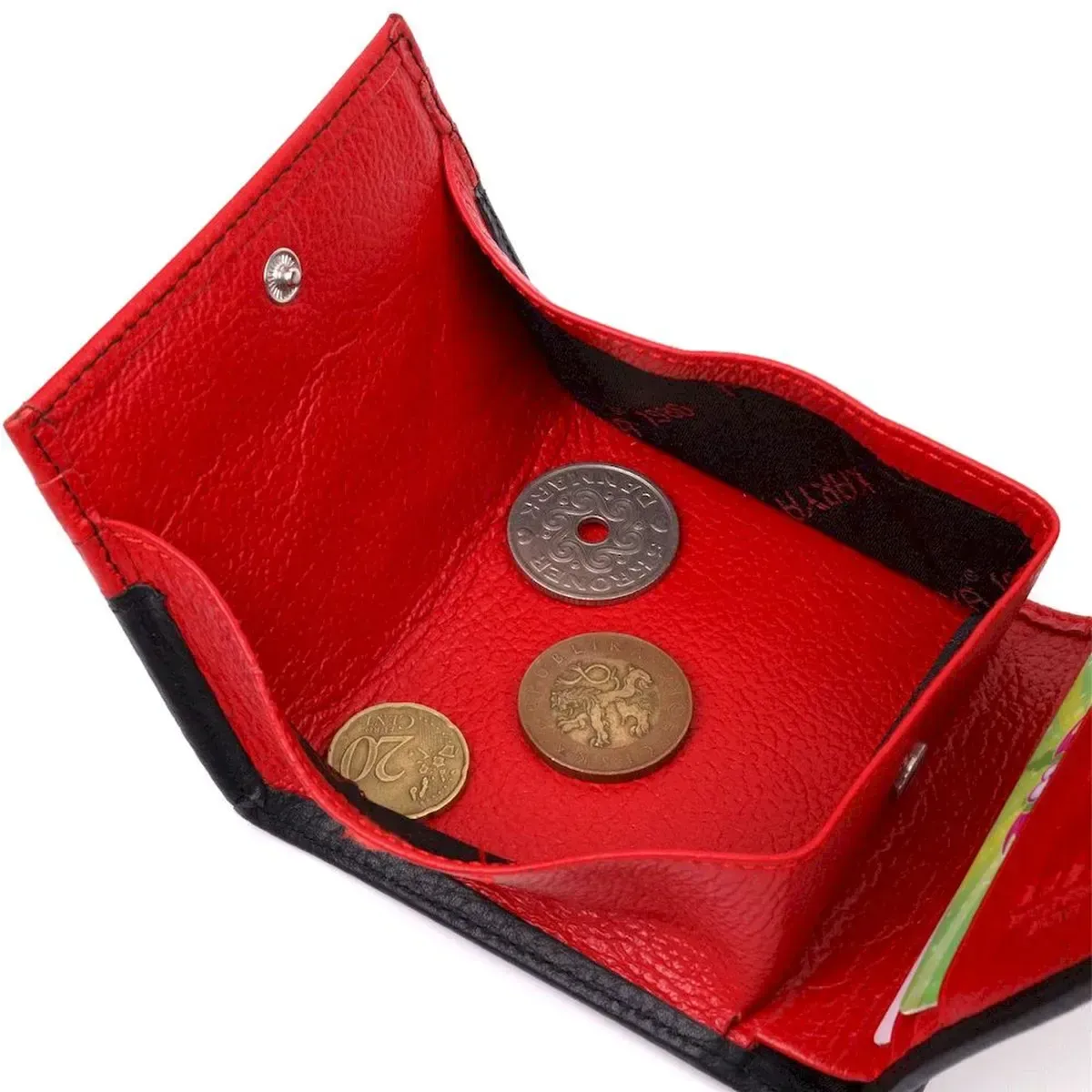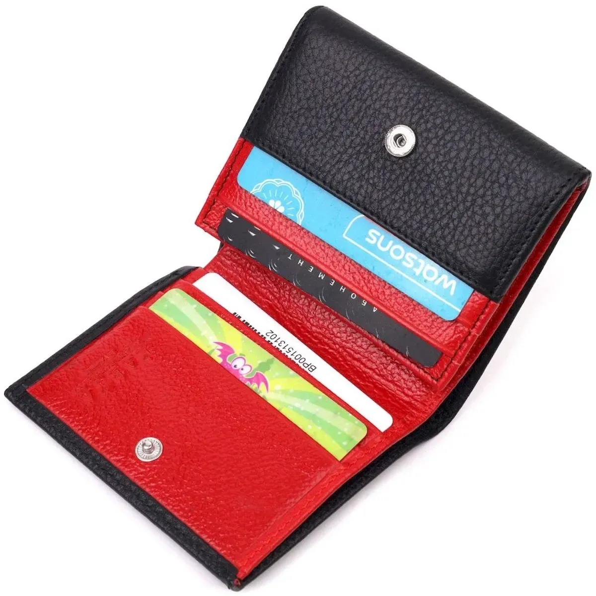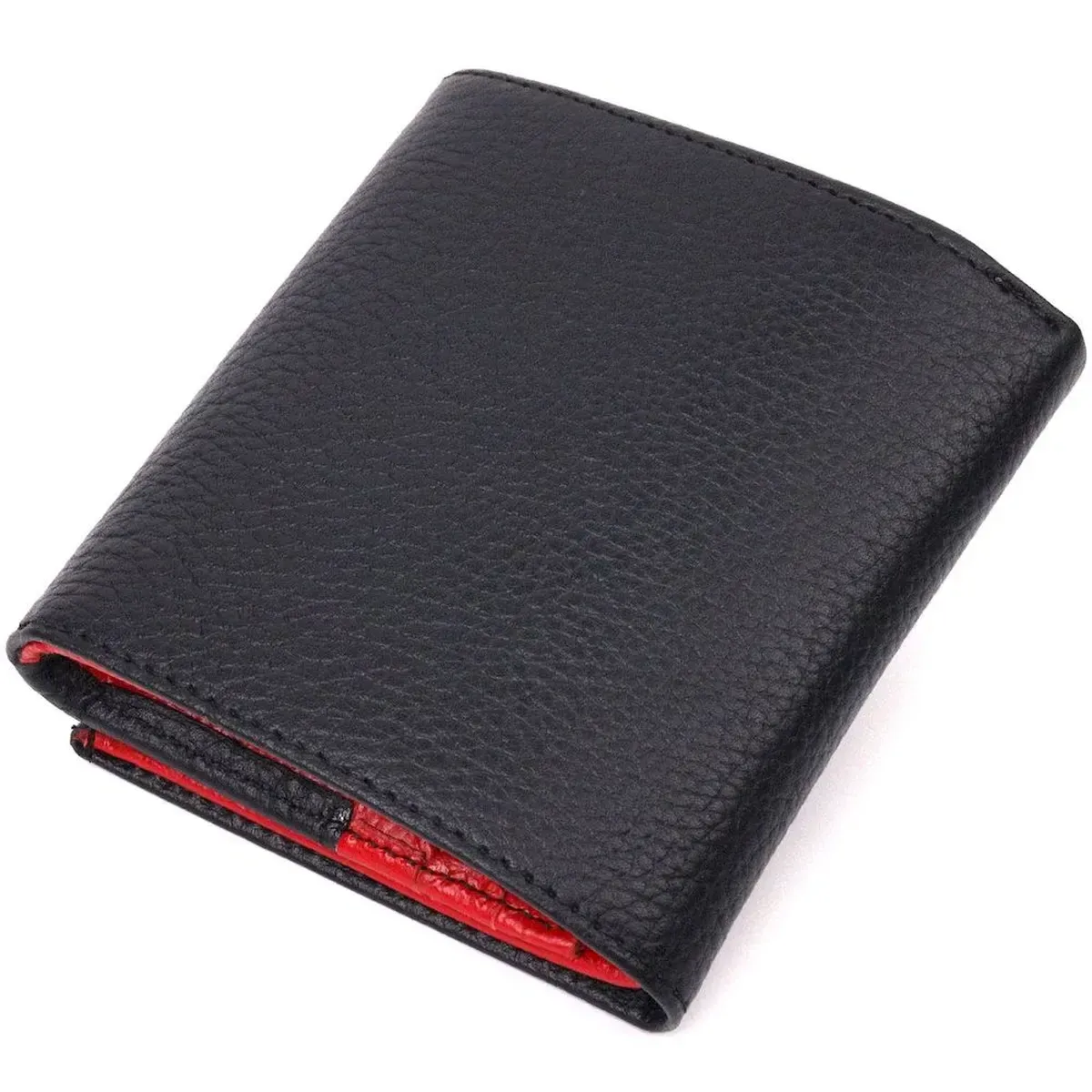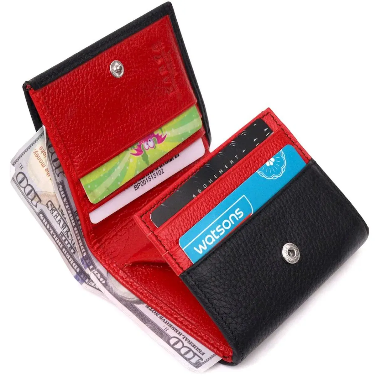 Превосходный компактный женский кошелек из натуральной кожи высокого качества, изделие классического черного цвета снаружи и красного цвета внутри. Внутри есть отделение для купюр, шесть ячеек для кредитных карт, необычная монетница и скрытый один карман. В изделии использована качественная фурнитура, а также прочная фирменная подкладка. Не большой кожаный кошелек поместится даже в самую маленькую сумочку. Закрывается модель в два сложения на кнопку. Такой кошелек, однозначно, порадует любую женщину.