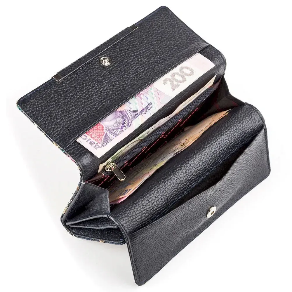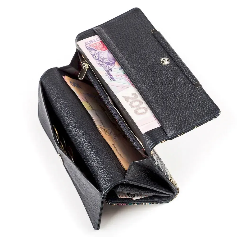 Яркий женский кошелек, из мягкой натуральной фактурной кожи. Аксессуар состоит из двух автономных частей. Первая часть закрывается на кнопку и имеет 14 ячеек для карточек, одно большое отделение для купюр и три скрытых кармана. Вторая часть также закрывается на кнопку и включает в себя одно большое отделение для купюр, и монетницу на молнии. Такой аксессуар не оставит равнодушной ни одну женщину. Женский кошелек из кожи отличное решение для подарка жене, маме, сестре, коллеге.