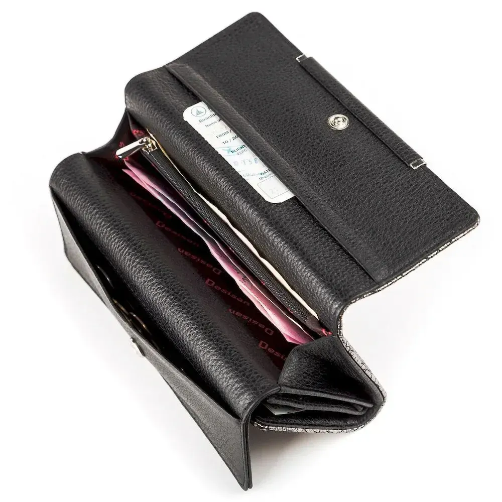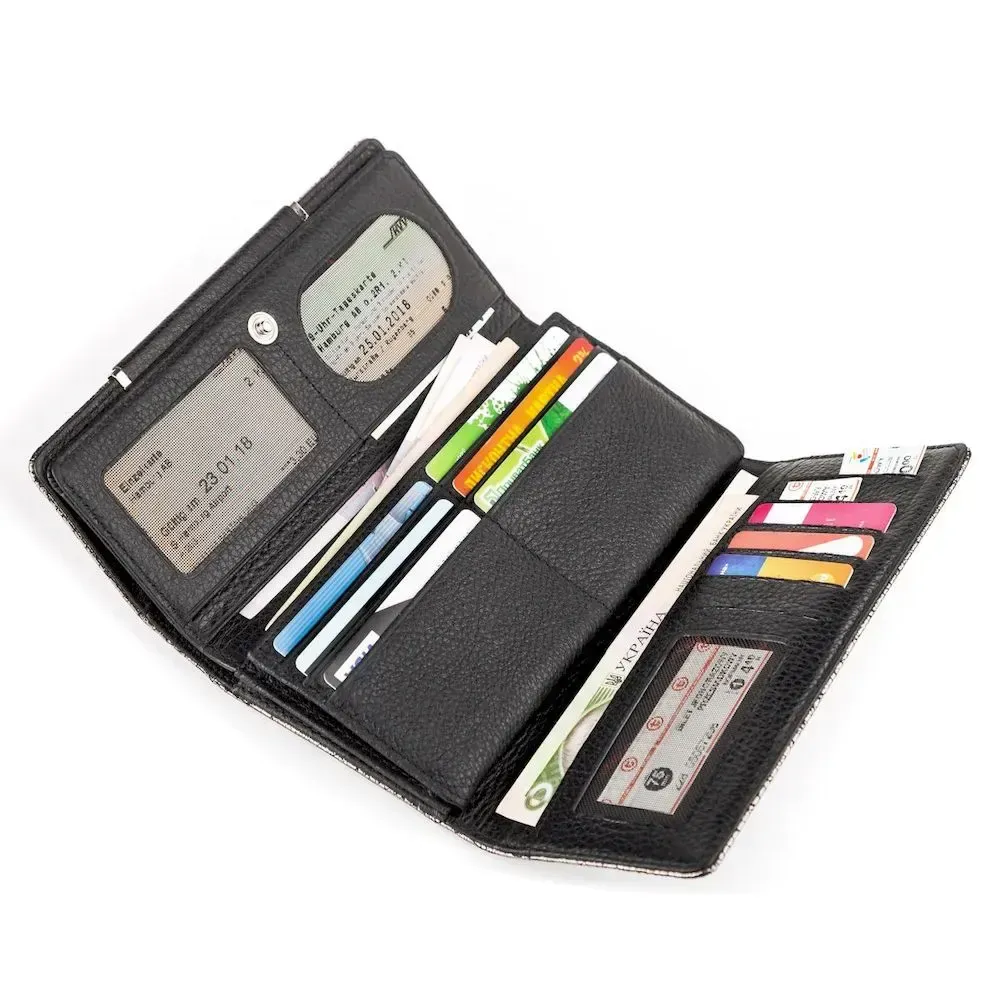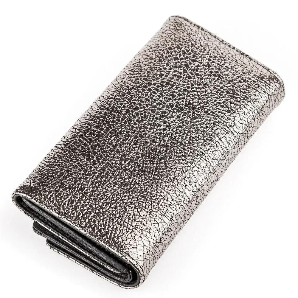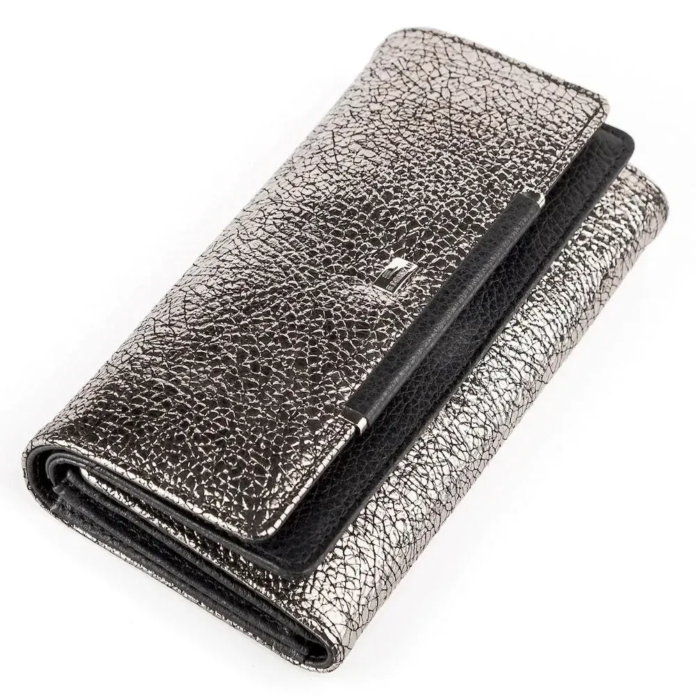 Вместительный женский кошелек, из мягкой натуральной фактурной кожи, серебристый снаружи и черный внутри. Аксессуар состоит из двух автономных частей. Первая часть закрывается на кнопку и имеет 14 ячеек для карточек, одно большое отделение для купюр и три скрытых кармана. Вторая часть также закрывается на кнопку и включает в себя одно большое отделение для купюр, и монетницу на молнии. Такой аксессуар не оставит равнодушной ни одну женщину. Женский кошелек из кожи отличное решение для подарка жене, маме, сестре, коллеге.