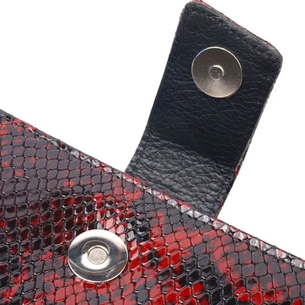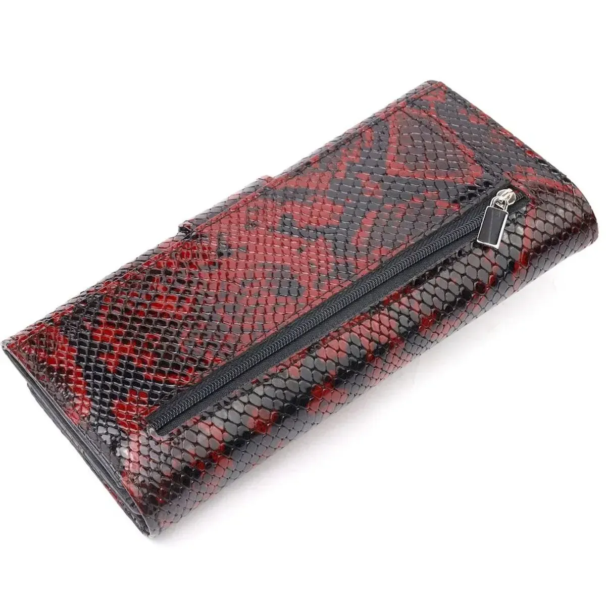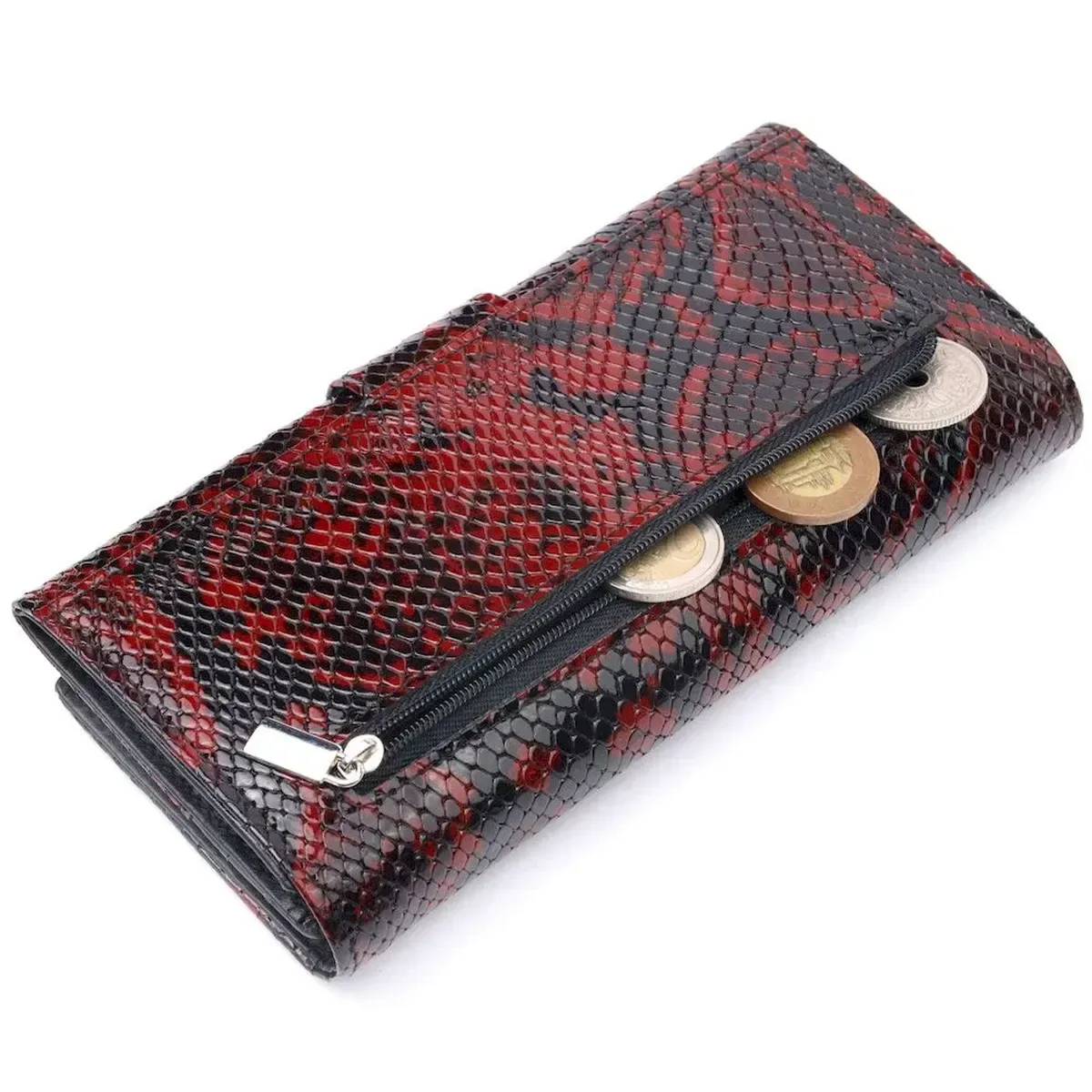 Превосходный женский кошелек из натуральной лакированной кожи, с тиснением под рептилию. Складывается аксессуар пополам, с фиксацией на хлястик и магнит. Особенностью данного аксессуара есть наличие блока для кредитных карточек, что закрывается на кнопку. Качественная фурнитура дополняет и украшает изделие. Такой кошелек из натуральной кожи - это идеальный вариант на каждый день для тех, кто ценит качество, удобство и комфорт, а также будет отлично дополнять Ваш повседневный образ.