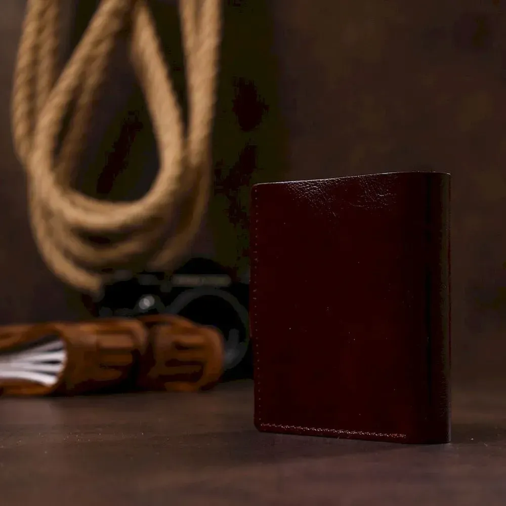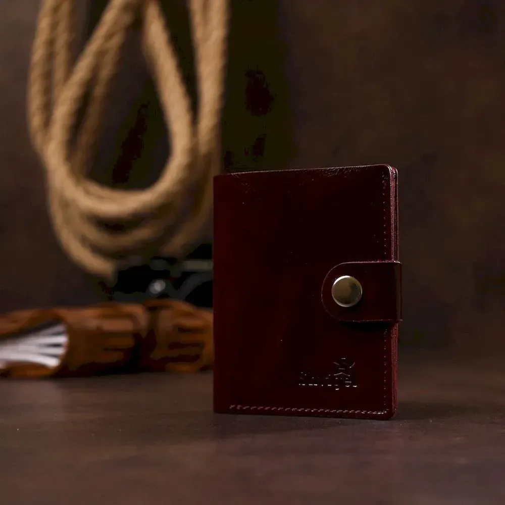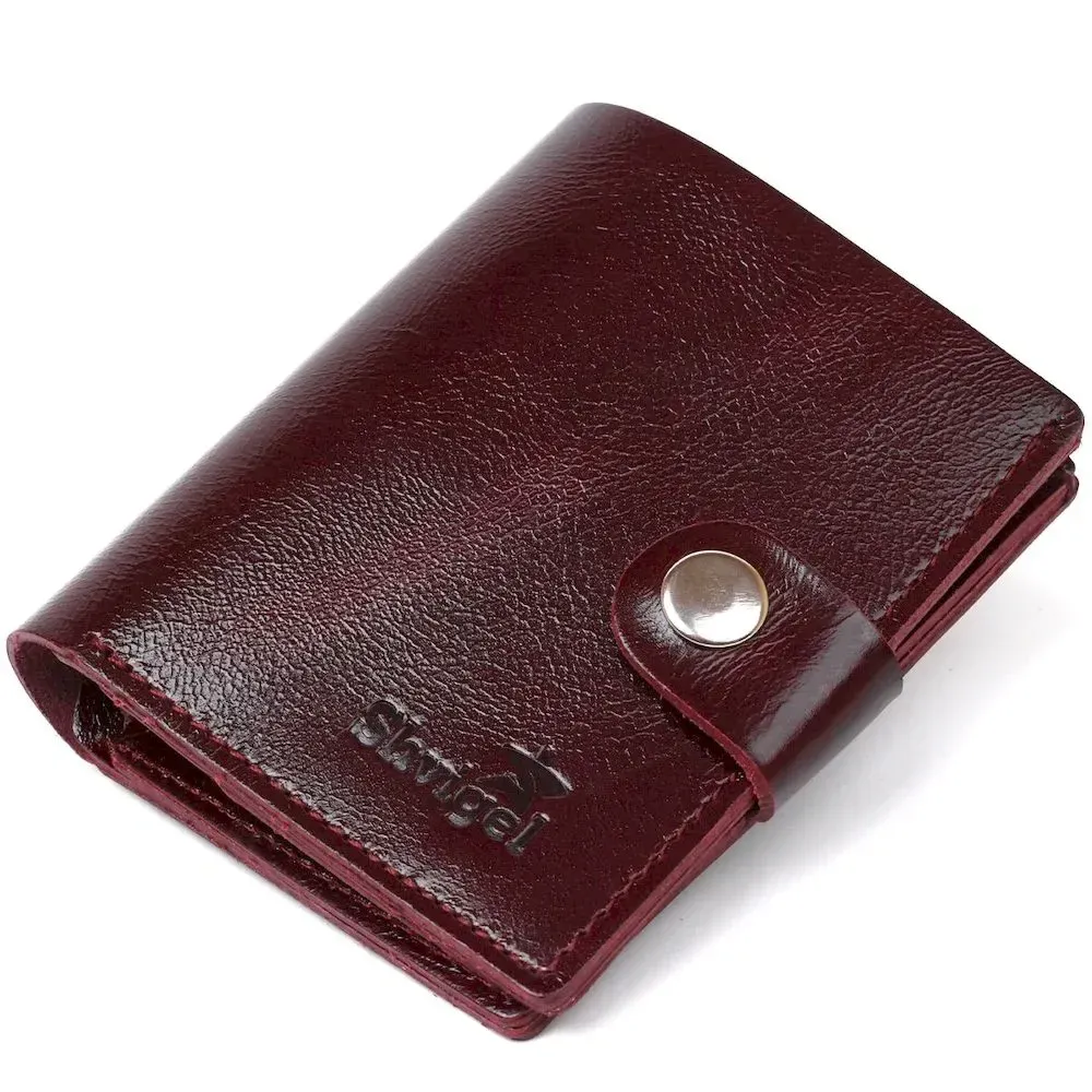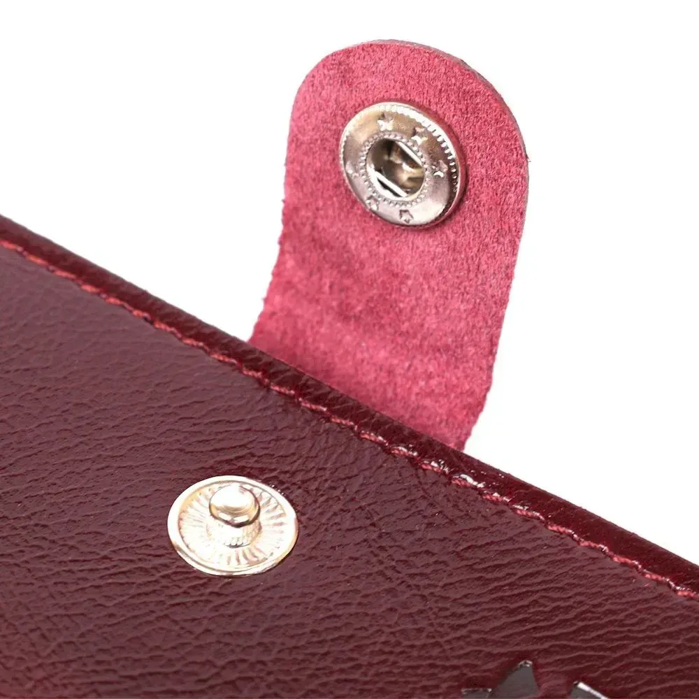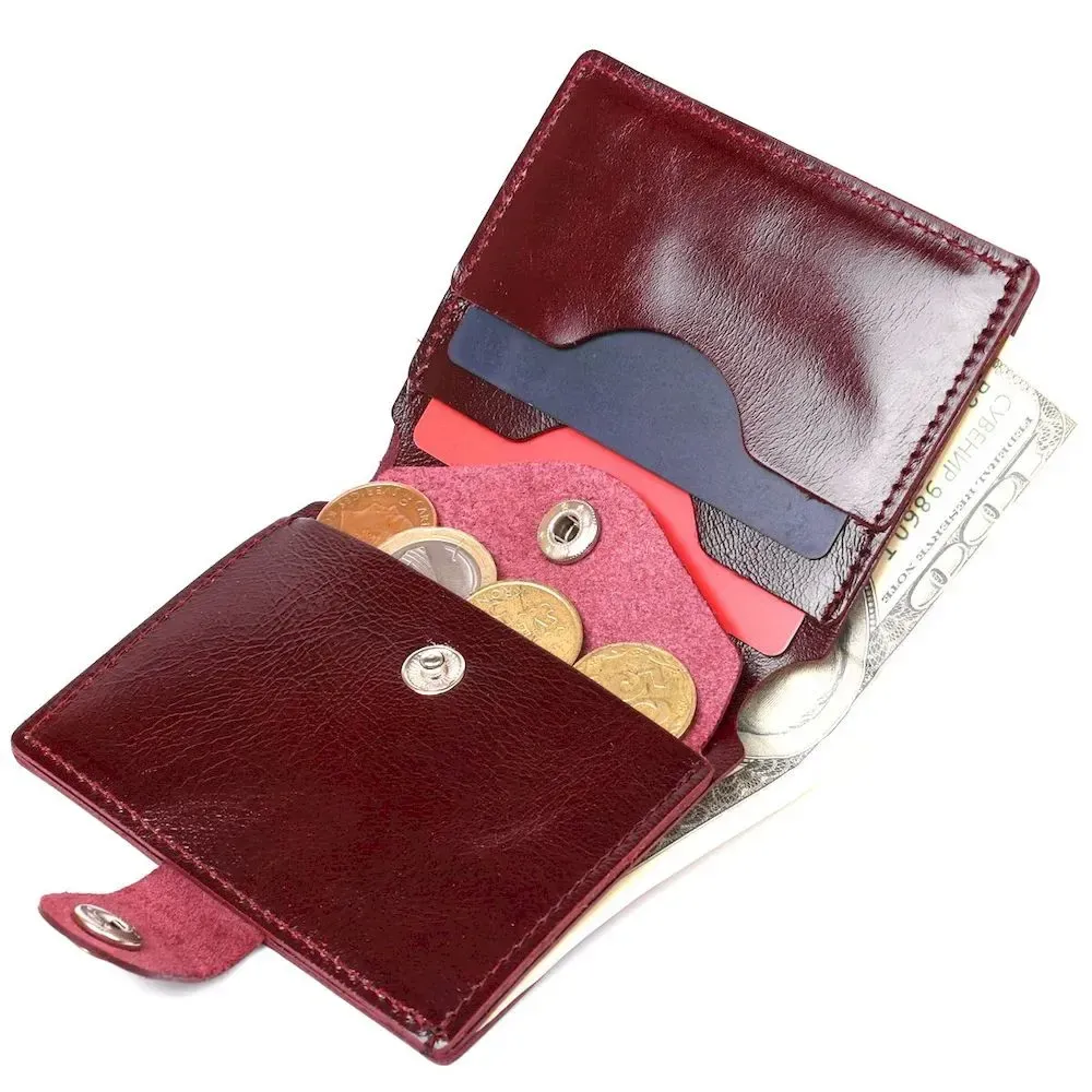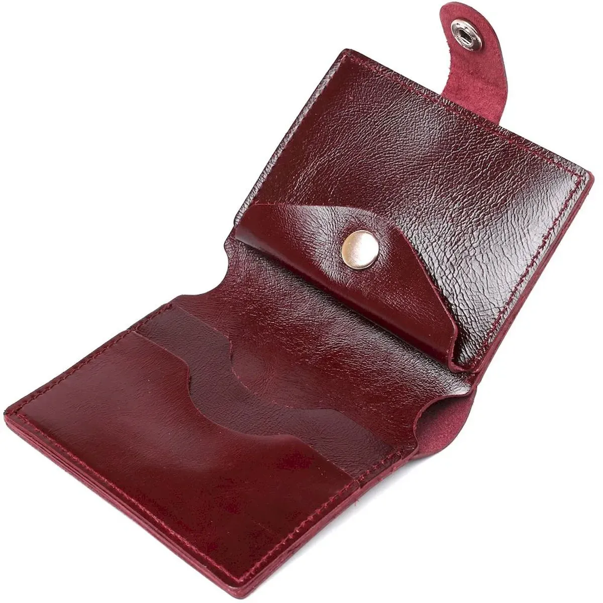 Стильное женское портмоне небольшого размера от украинского производителя. Имеет красивый темно-бордовый цвет с легким отливом, что смотрится очень красиво. Выполнено изделие из натуральной высококачественной кожи с прекрасными характеристиками износоустойчивости. Внутри есть вместительное отделение для купюр, слоты для карточек и монетница на кнопке.