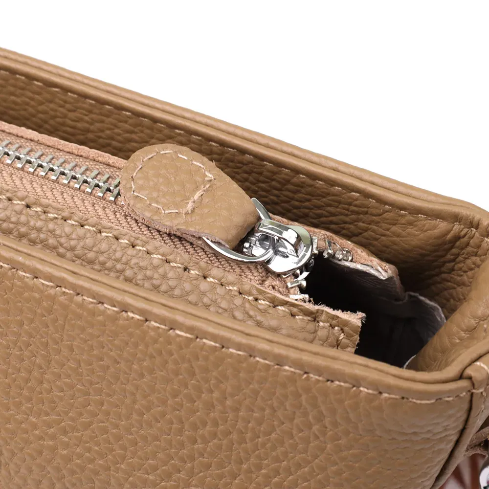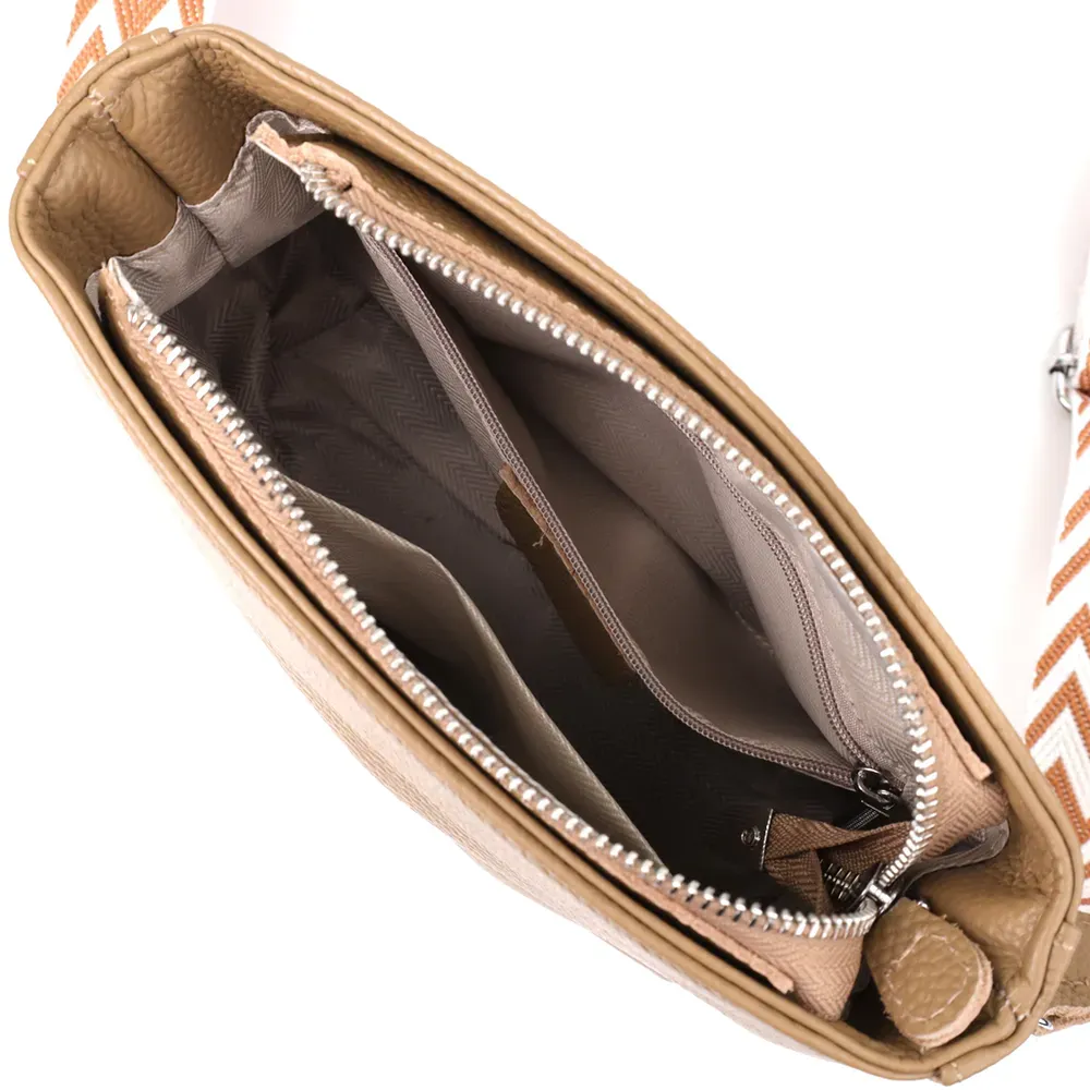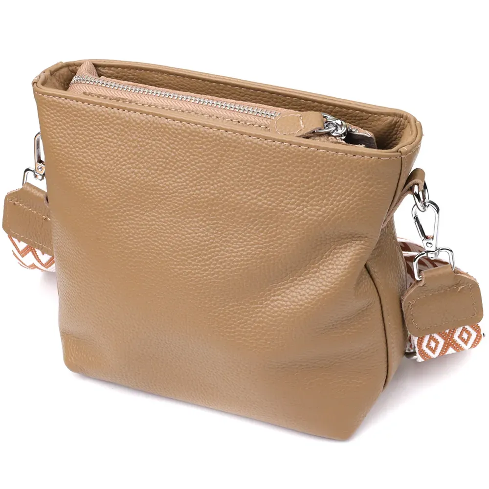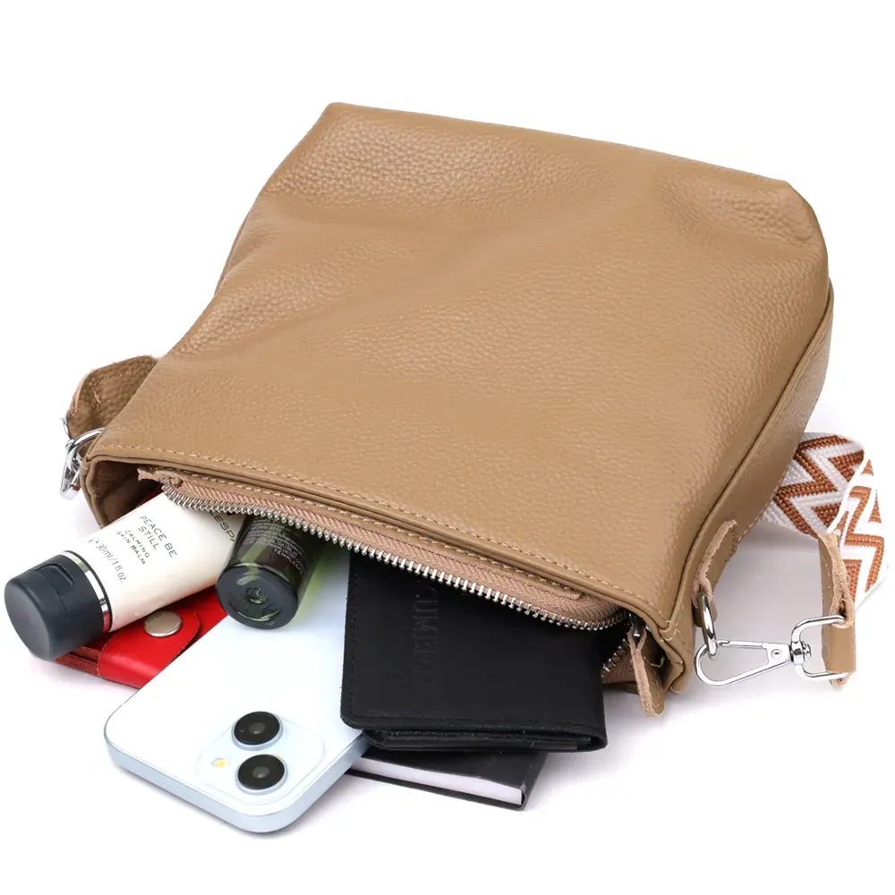 Елегантна бежева сумка з натуральної шкіри - це гармонійне поєднання стилю, зручності та універсальності. Модель оснащена одним основним відділенням, яке закривається на блискавку, надійно захищаючи вміст. Усередині передбачені дві функціональні кишені: потайна кишеня на блискавці — для зберігання документів або інших цінних предметів, і відкрита кишеня — для речей, які мають бути під рукою.